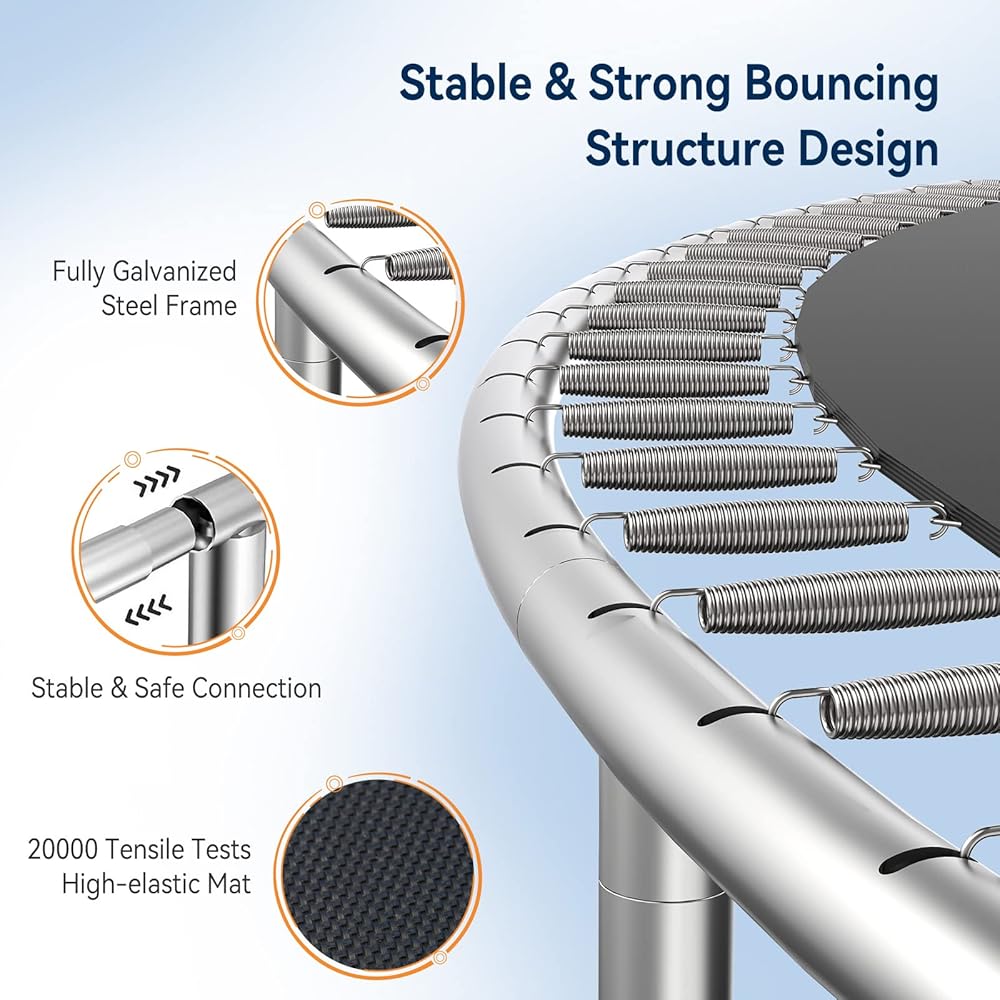 【Excellent Structure and Materials】 The outdoor trampoline frame is supported by high-quality galvanized steel, anti-UV and anti-rust material can effectively deal with outdoor sun and rain