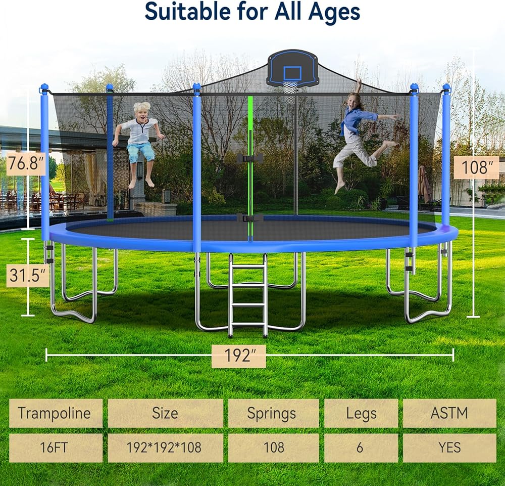 【Easy Assembly】 This 16ft recreational trampoline is easy to assemble. Please read the instructions before assembling. The step-by-step instructions greatly reduce the assembly time
