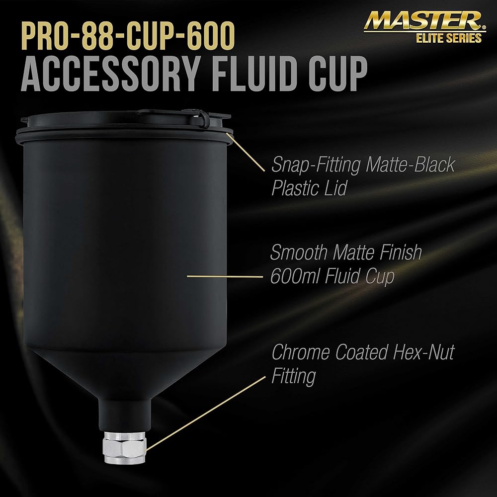 Master Elite 600ml Black Aluminum Gravity Feed Spray Paint Gun Cup with Drip-Free Plastic Push-On Lid - Cup Fits All Master Elite PRO-44 & PRO-88 Series HVLP Spray Guns