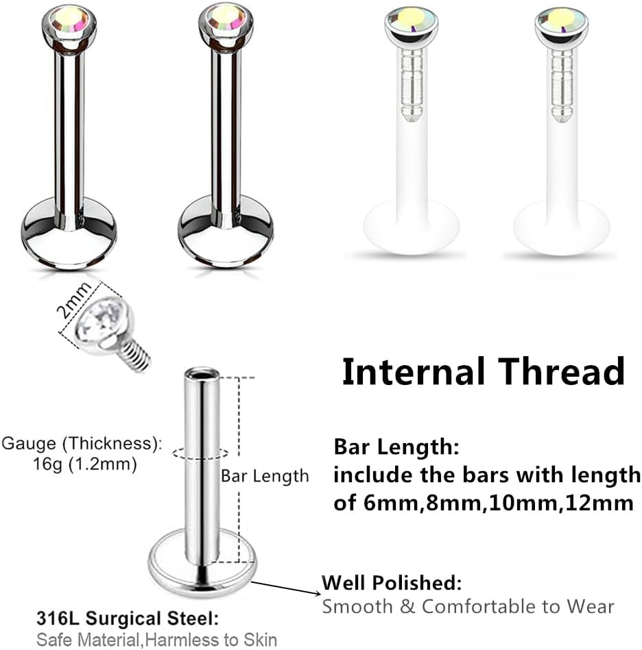 GOOD PRICE PIERCING: 8pc multi cz crystal labret (include bars with length of 6mm, 8mm, 10mm and 12mm)