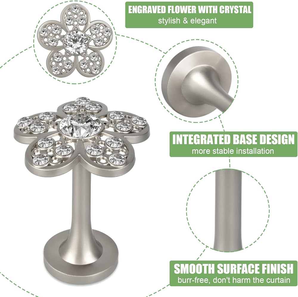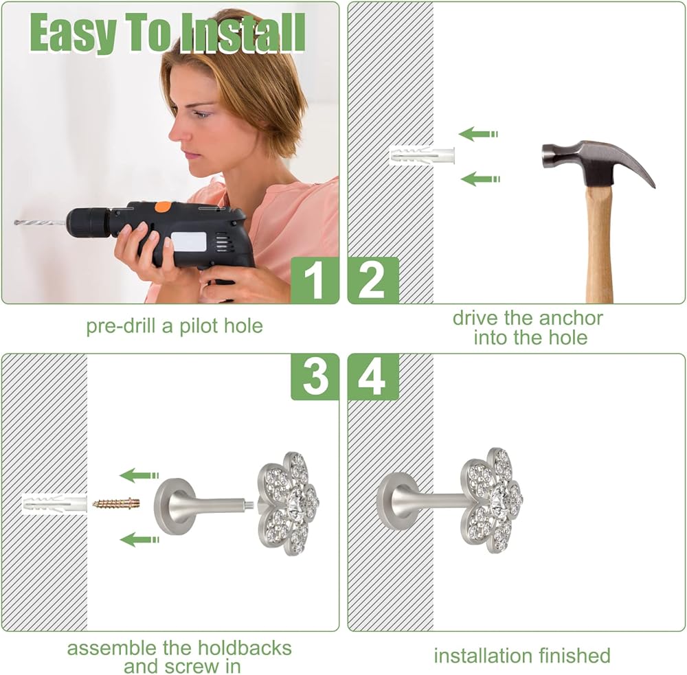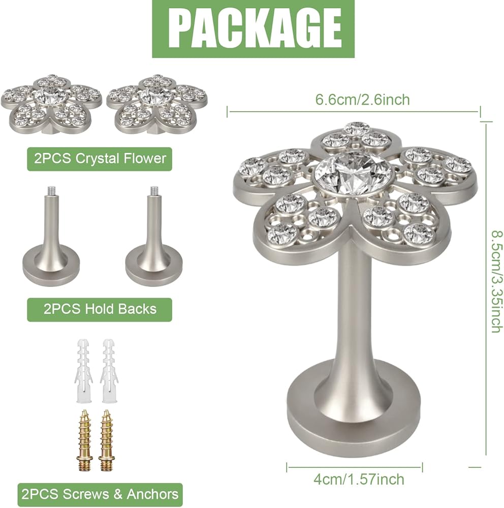 【Easy To Install】💗 Come with anchors and screws, easy to install in minutes. Curtain holders for drapes suit for any style home decors, such as country, retro, modern, American, European, Middle East style etc. Gorgeous curtain holdbacks for wall, beautiful crystal flower appearance, adding a touch of elegance and fashion taste to your room.