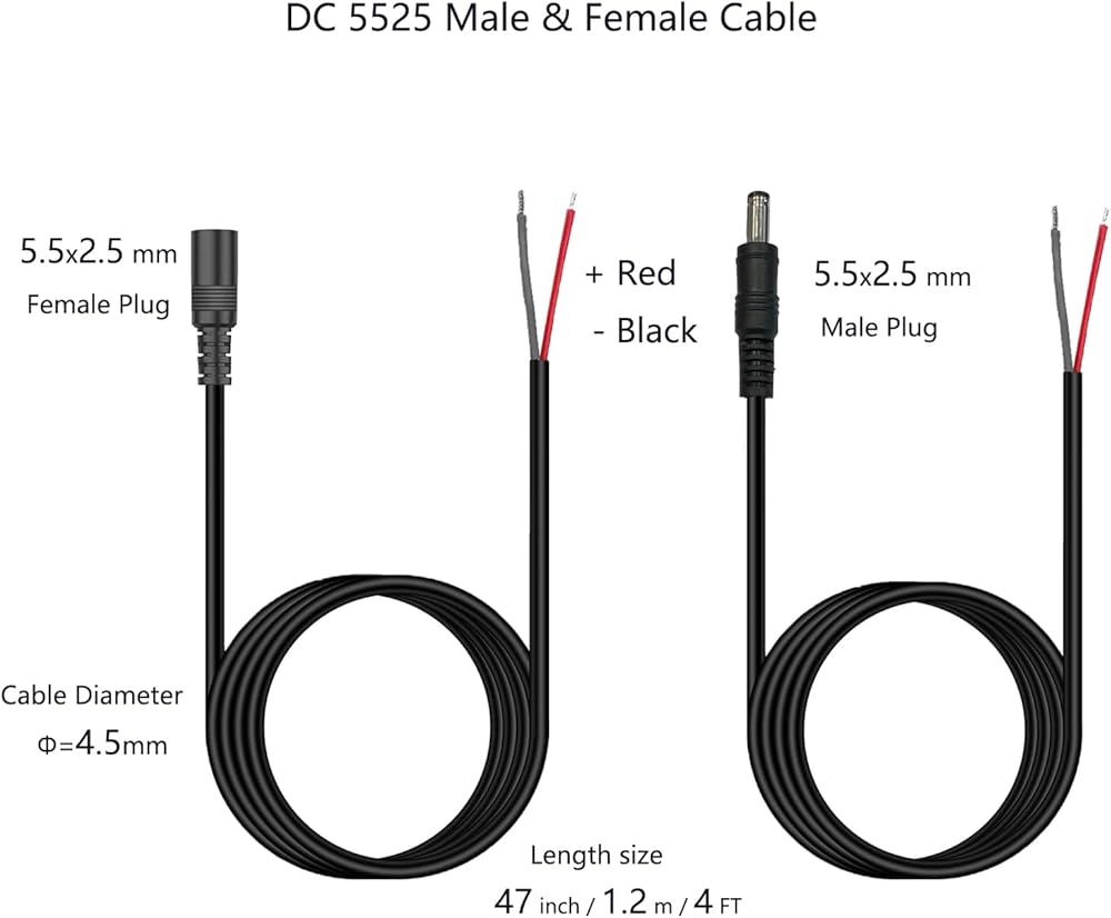 4 FT Design: DC 5.5mm x 2.5mm 5525 male and female plug 4ft/1.2m/47inch length design, compare with other 3ft our 4 ft long enough for your using.