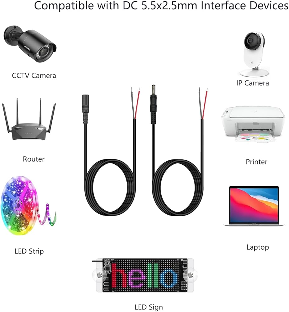 Compatible with: DC 5.5mm x 2.5mm 5525 male and female plug power pigtail wire, compatible with replacement dc 5525 power wire for worn out or broken, such as 12V and 24V DC power supply equipment,wireless IP camera,CCTV security camera, router, printer, Led strip more DC 5525equipment products.