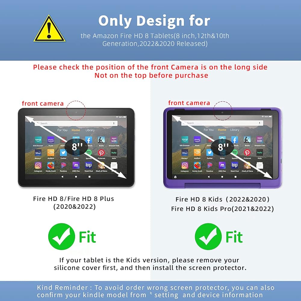 [Kinder Reminder]This product is designed to protect the screen of the All-New Fire HD 8/Fire HD 8 Plus/Fire HD 8 Kids(2022/2020)& Fire 8 Kids Pro (2022/2021). Verify your Kindle model before purchasing to avoid the screen protector film size is too large, the problem of small, or the installation is difficult.