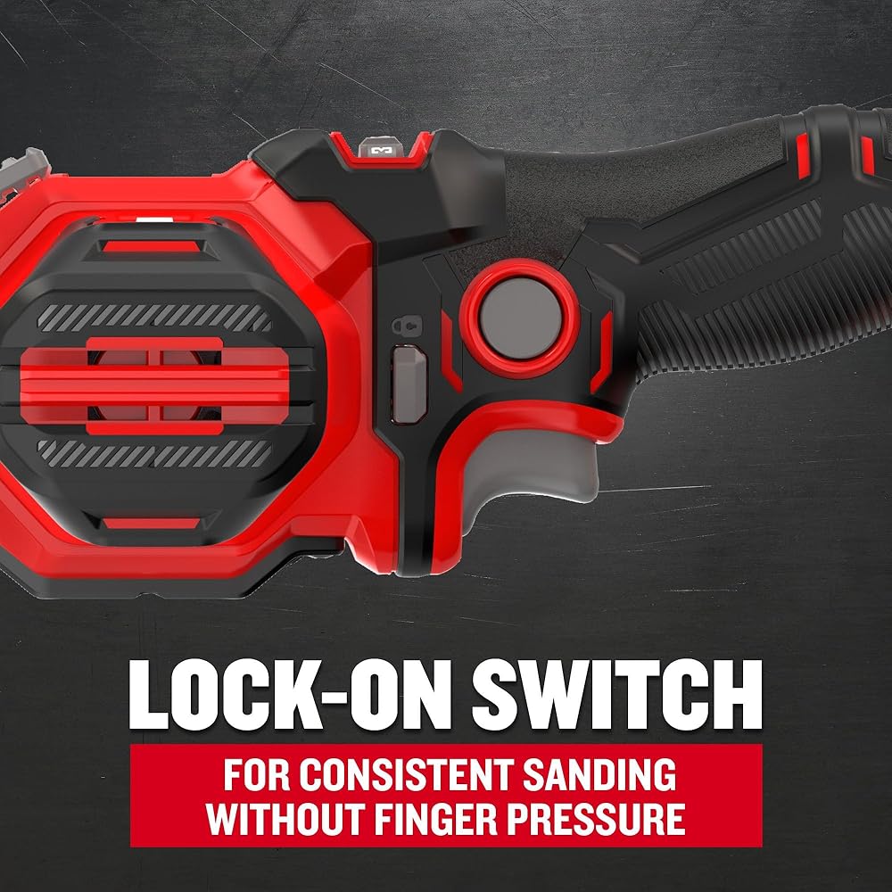 Lock-on Switch: Allows for consistent sanding without having to worry about finger pressure for speed in tight spaces