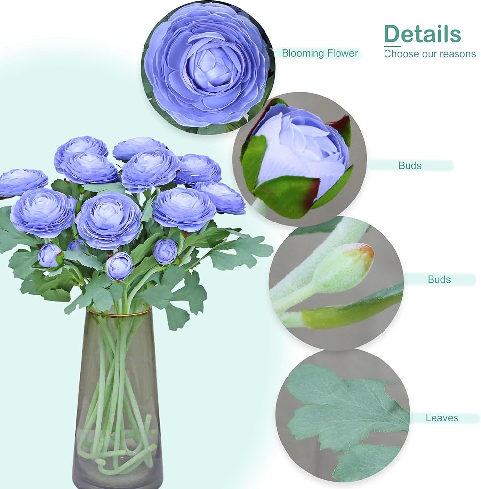 🌸[FLOWER] Blooming flower and buds are made of high quality faux silk. The artificial ranunculus flowers petal is excellent hand feeling and elasticity. You can feel it's soft and relastic like real ranunculus flowers