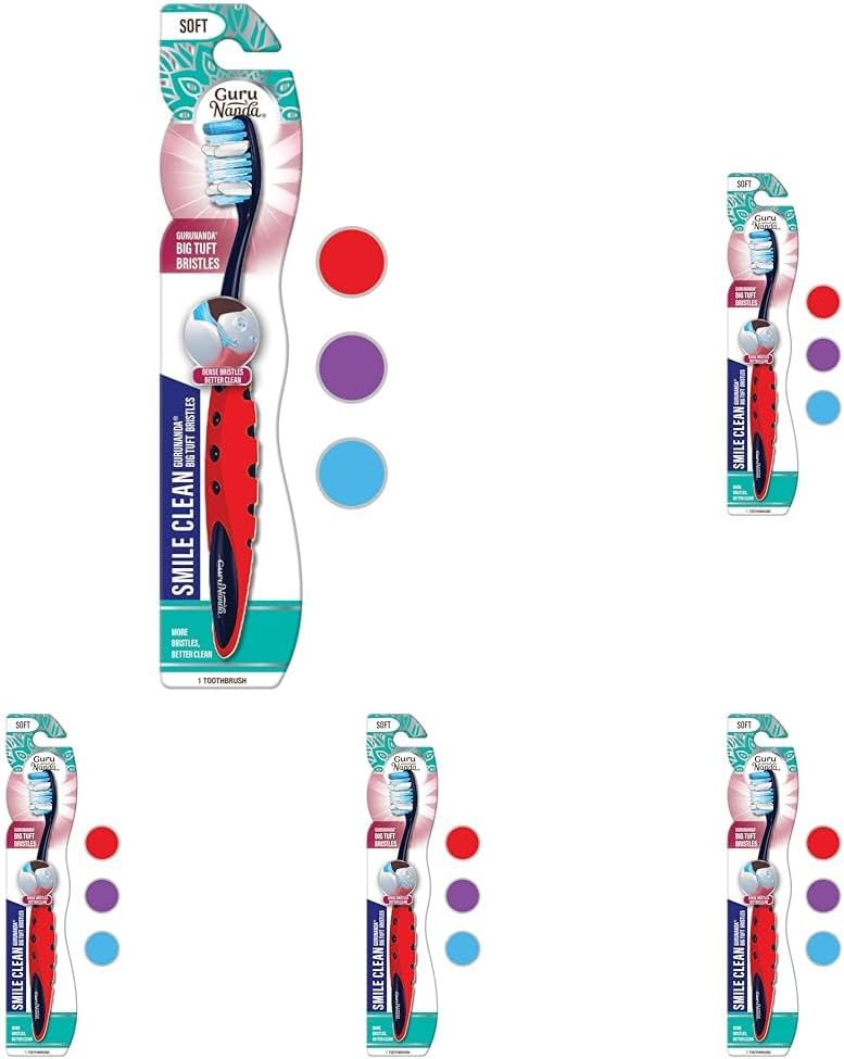 GuruNanda's Smile Clean Toothbrush has Big Tuft dense soft bristles that are designed to help clean tooth surfaces more effectively while not being too hard on your teeth or gums. Colors may vary.