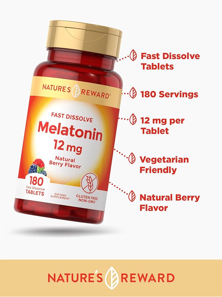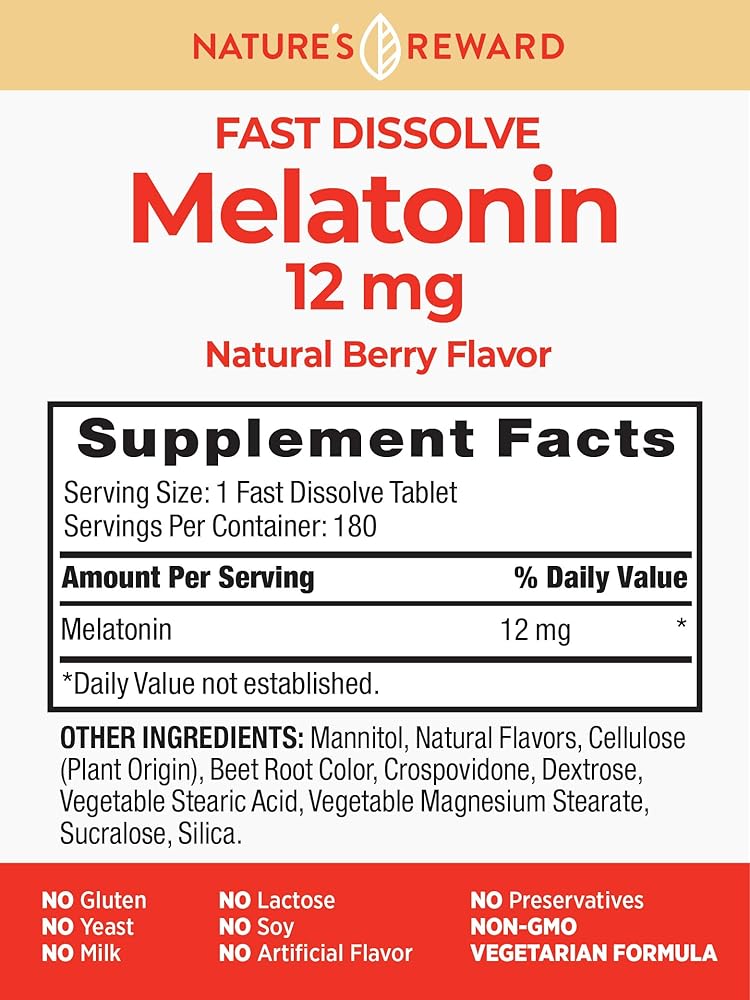 Catch some sweet Zzzs with Nature's Reward Melatonin Fast Dissolve Melatonin tablets. These natural berry flavored tablets are vegetarian, delicious, and each fast dissolve tablet delivers 12 mg of Melatonin. They will make the perfect addition to your routine.