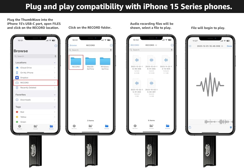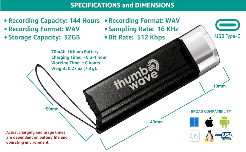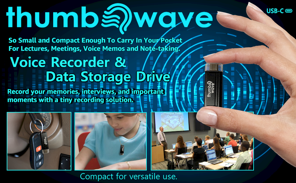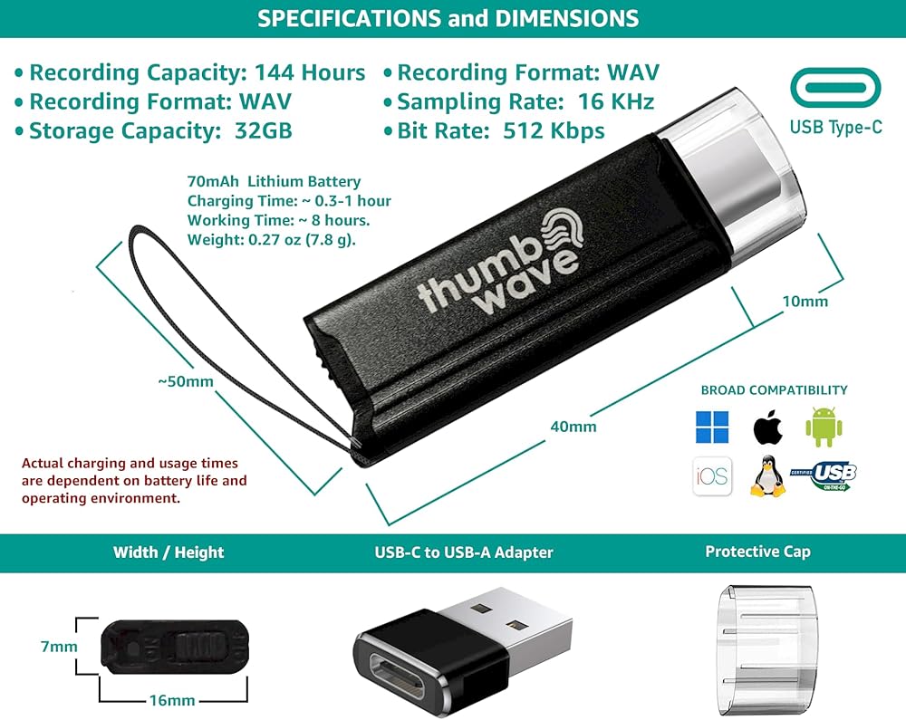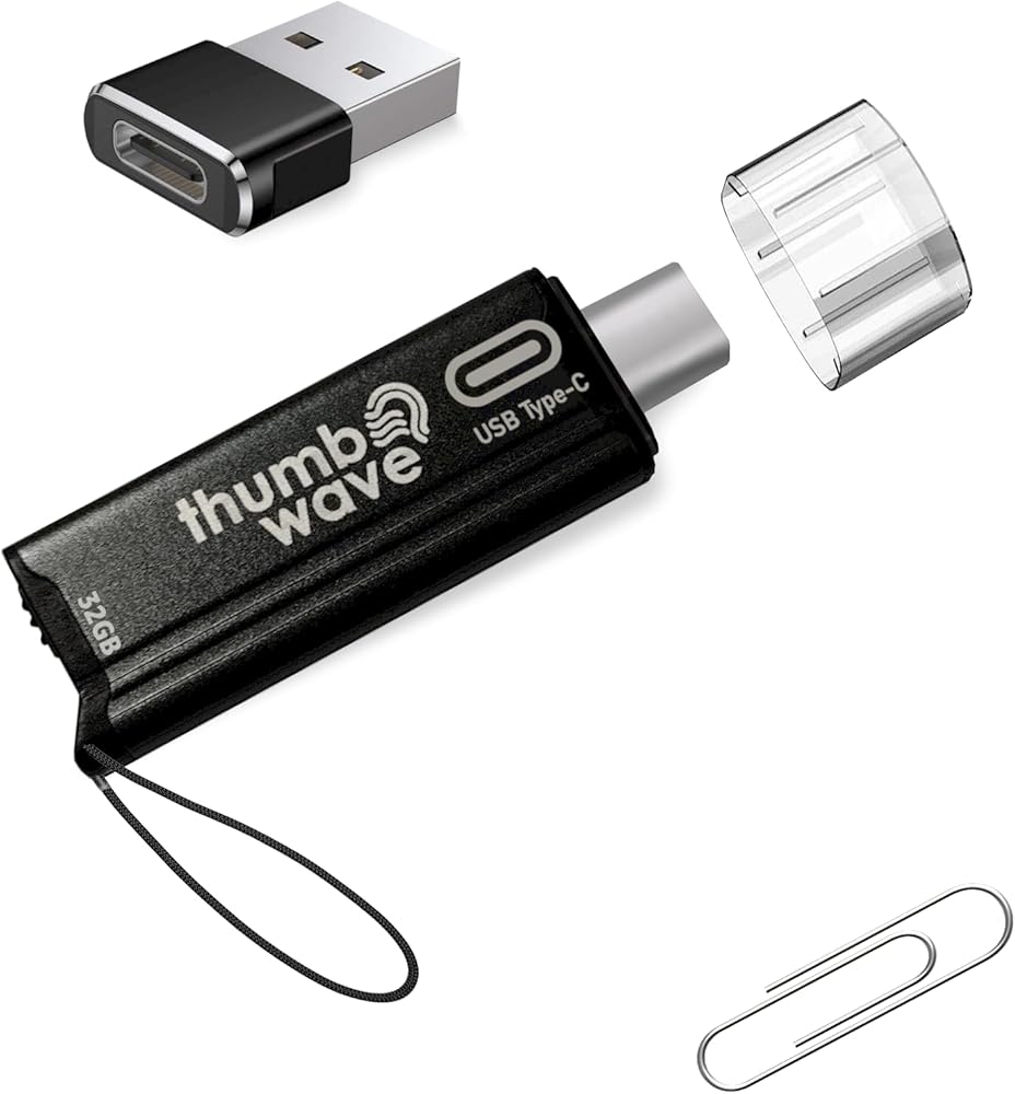 ThumbWave 32GB USB-C Audio Recorder Flash Storage Drive with 144 Hour Audio Recording Capacity for Business Meetings, Lecture Notes, Musical Inspiration, Personal Memoirs