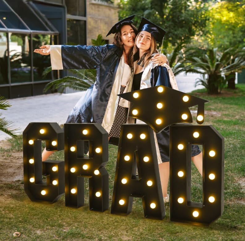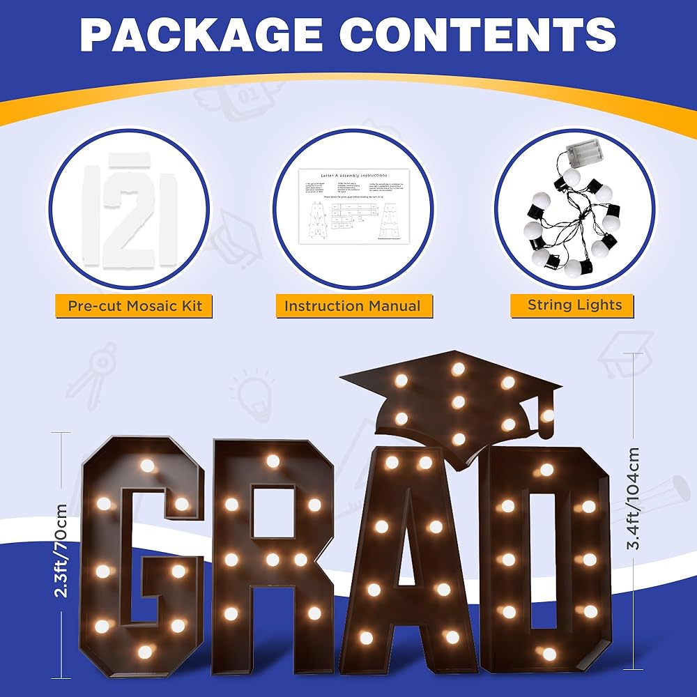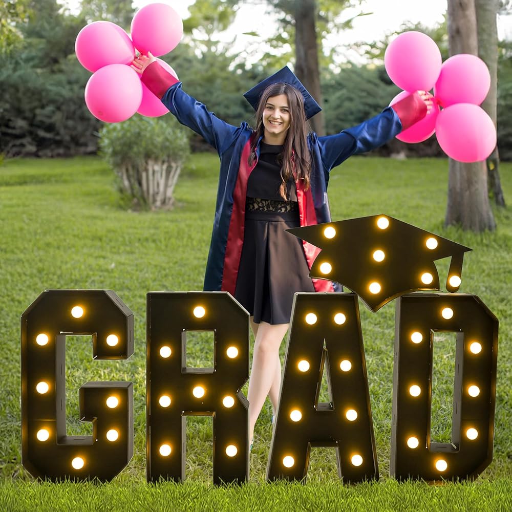 Complete Graduation Set: Celebrate your milestone in style with our "GRAD" marquee letters and graduation cap set, complete with 5 strings of warm LED lights and 5 rolls of double-sided tape. Everything you need to create a memorable graduation display is included.