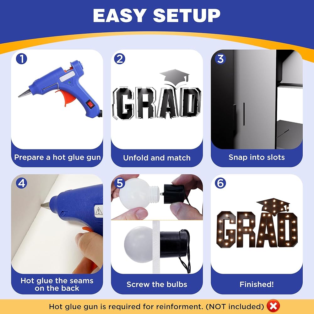 Brighten Your Celebration: Illuminate your grad party with warm LED lights included in the kit. These lights cast a cozy glow, making your "GRAD" marquee letters shine and creating an inviting atmosphere for guests.
