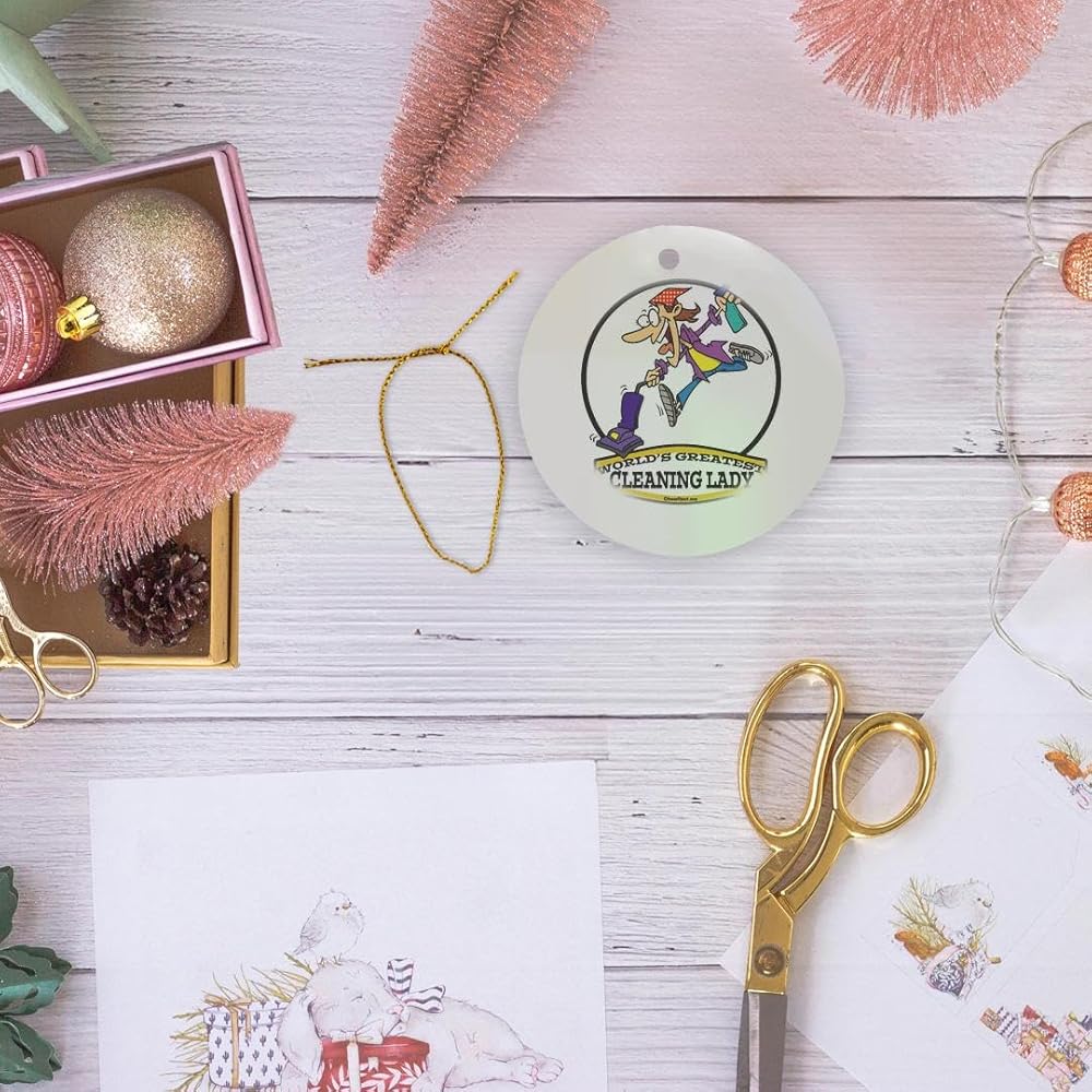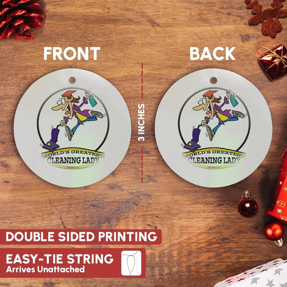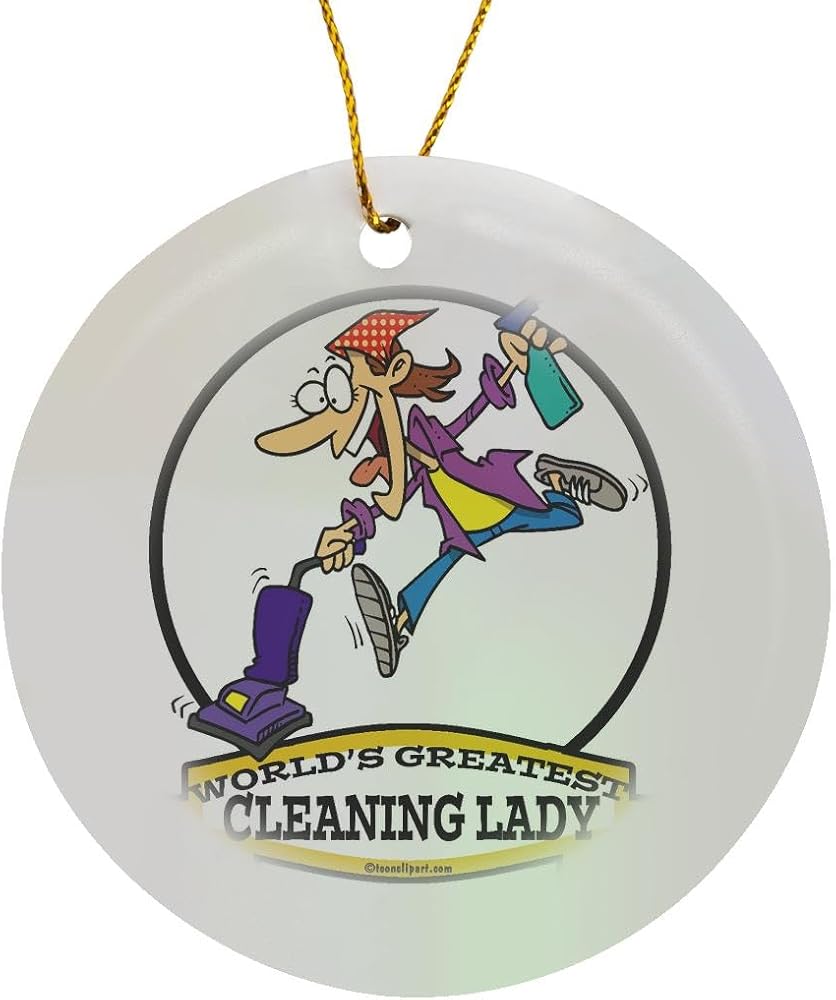 Funny Worlds Greatest Cleaning Lady II Cartoon Ornament is a perfect addition to your tree or as a window decoration. This glossy porcelain ornament is a great gift for family and friends, commemorating each holiday or special occasion. Image printed on both sides; measures 3 Inch. A strand of gold thread makes it easy to display this fantastic keepsake.