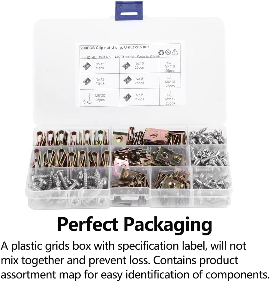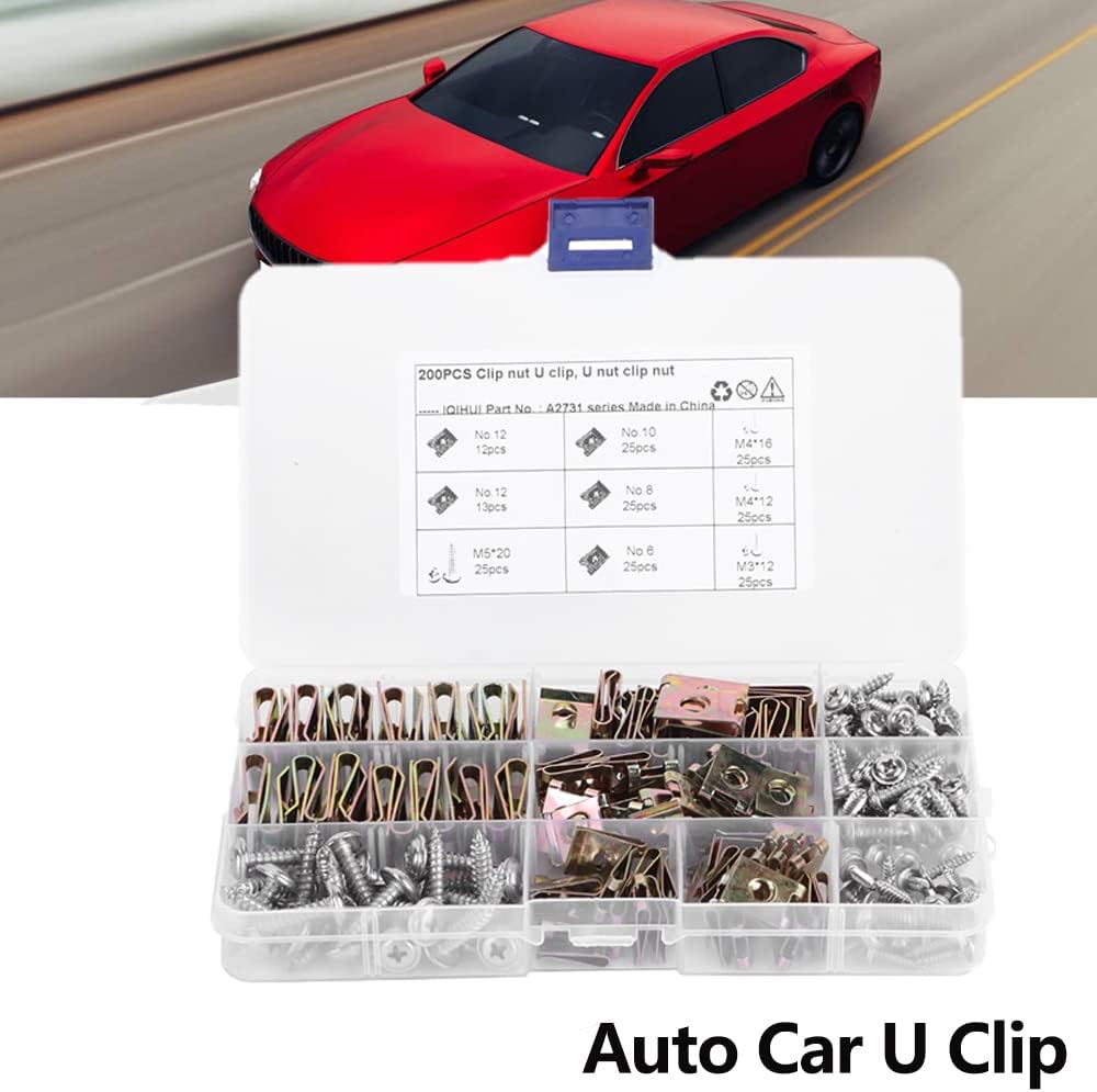 ASSORTMENT KIT - The automotive screws and clips assortment kit includes 100pcs u clips and 100pcs screws total 200pcs are neatly organized in a divided storage case with chart inside lid for easy selection.