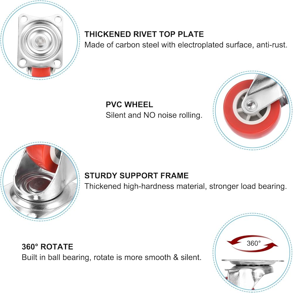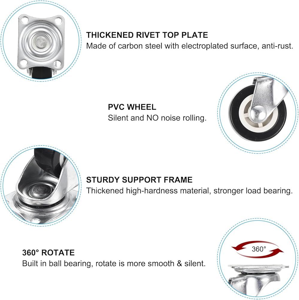 The caster wheels are made of PVC material, which has strong pressure resistance, wear resistance, easy to clean, does not damage the floor, silent and no noise rolling; it has built-in high-hardness balls and can rotate 360 degrees flexibly and smoothly. Thickened carbon steel bracket, surface galvanized, rust-proof and durable.