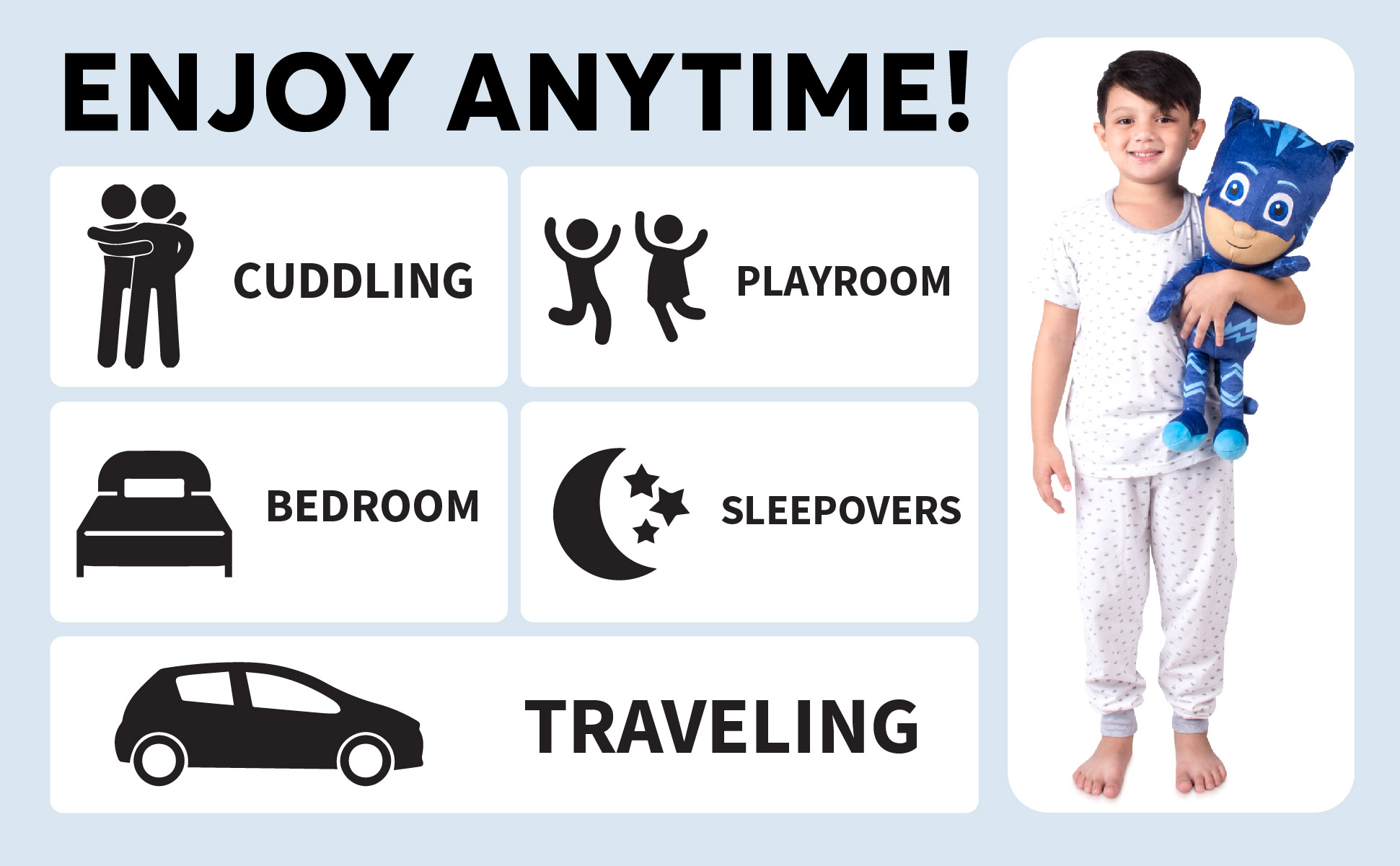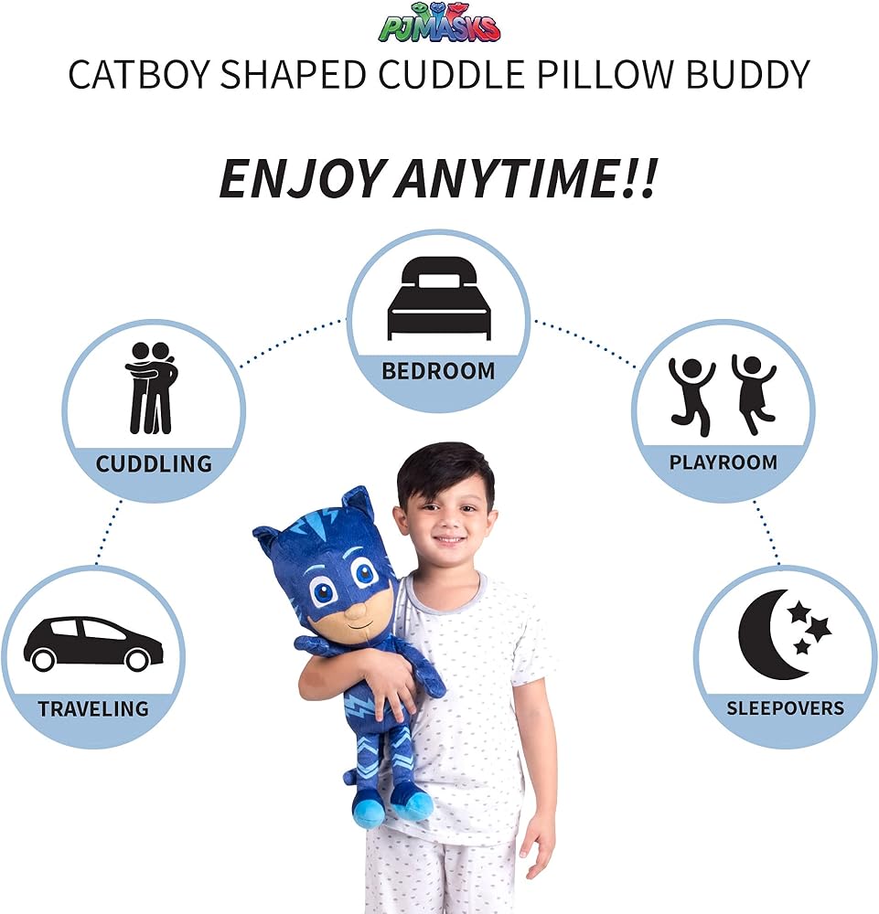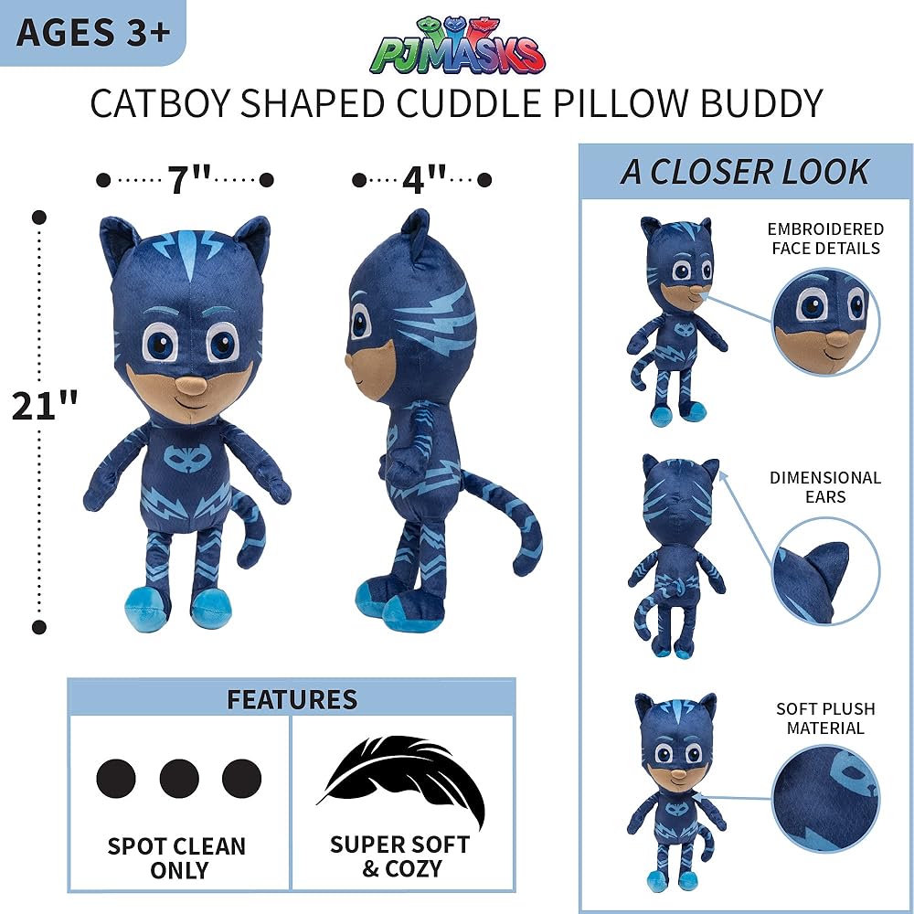 FUN AND CUDDLY: Bring a sense of adventure to bedtime or playtime with this super soft Cat boy plush cuddle pillow. Colourful imagery and embroidered detailing help bring this popular PJ Masks character to life. A great travel accessory for use in home, car, camping and sleepovers for napping and cuddling.