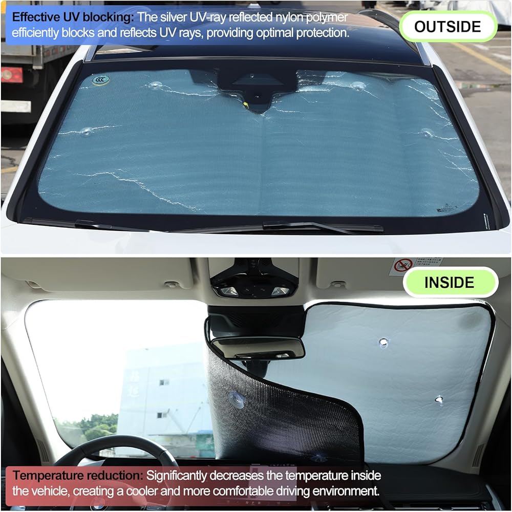 🏎️『Keep Vehicle Cool』: The Car Windshield Sun Shade is an affordable and convenient solution in Blocks Heat and Sun. Keeps Your Vehicle Cool even in the blistering summer weather. It also can Avoid interior aging caused by high temperature exposure.
