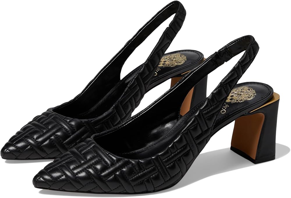 An update to our classic mid heel, pointed toe slingback pump. Still available in an array of colors and detailed with metal heel rand, and now it is quilted. Comfort abounds from a padded footbed to an elastic gore in the slingback strap.