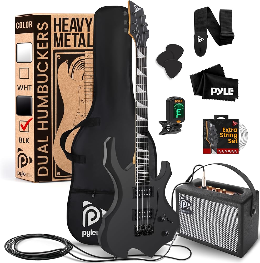 Features: Standard Full-Size Guitar 6-String Traditional Electric Style Hand-Crafted Wooden Construction Adjustable Rotary Controls, Volume & Tone Chrome-Accent Hardware & Tuner Pegs High Gloss Coating & Polished Guitar Body / Back Color: Black, Glossy Finish Pickup: 2x Humbuckers 3-Way Switch Controls: (1) Volume, (1) Tone PU selector: 3-ways Scale: 25.5'' -inches, 24F Bridge: Classic S Style Tremolo Machine Head: Diecast, Chrome With Guitar Cable, Allan key and Tremolos Rod Amplifier Features: 10W Amplifier, All Black 5'' Loudspeaker Specially Designed for Enhanced High-Frequency Response Functions: Input, Drive Switch, Volume, Treble, Bass, Headphone Output Portable and Lightweight for Easy Transport Includes Headphone Output for Silent Practice Cabinet Material: Lightweight Plywood, Coated by High-Quality Leather What's in the Box: 6-String Electric Guitar 10w Amplifier 98.4'' -inches Guitar Cable Allan Key and Tremolos Rod Gig Bag (6) Spare Electric Guitar Strings + Extra 1st String Detachable Shoulder Strap Digital Tuner (3) Celluloid Picks Digital Guitar Tuner: Convenient Clip-on Design Tuning Range: A0 - C8 (27.5 - 4186 Hz) Response Time: