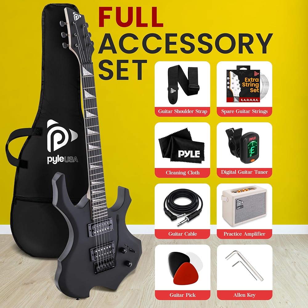 FULL STARTER PACKAGE: Electric guitar kit w/ amp comes with (1) guitar cable, (1) Allan key, (1) tremolo rod, (1) gig bag, (6) spare electric guitar strings, (1) guitar strap, (1) digital tuner, & (3) 0.96mm celluloid picks for precision