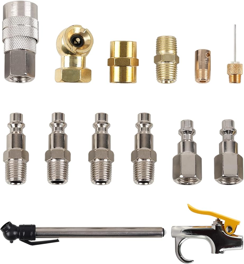 The 14-piece accessory is the ideal kit for any air compressor system. It has 1/4 inch industrial quick coupler, plug, connector for airline or air tools connection.