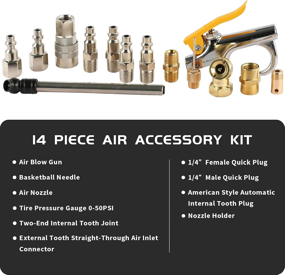 14 Piece Accessory Kit includes Air Blow Gun, Gauge, Inflation Needles, Safety Nozzle, Hose Connector, Female and Male Quick Plug, Air Chuck, Female Quick Coupler