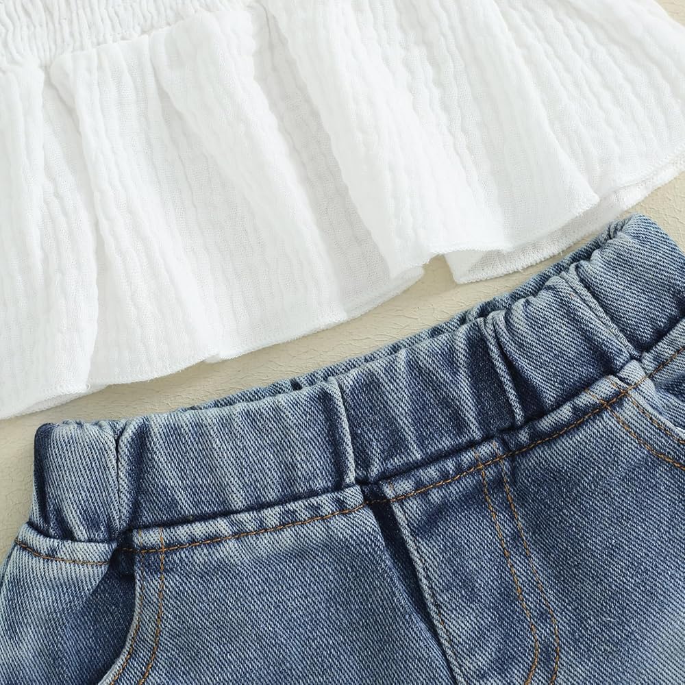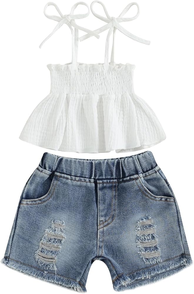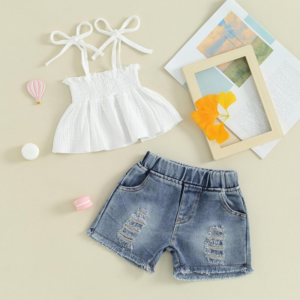 Kids Toddler Girl Clothes 18 24 Month 2T 3T 4T 5T Jeans Girls Shorts Set Smocked Ruffle Cami Top Ripped Denim Shorts
