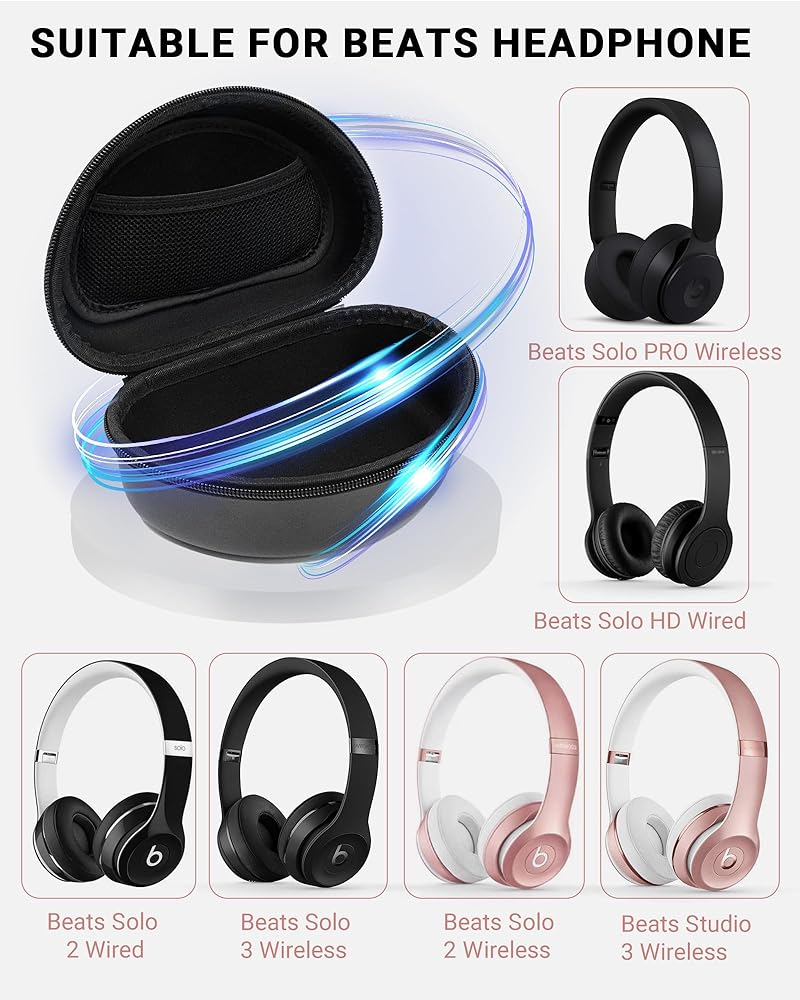 【Widely Compatible】 The headphone carrying case is compatible with Beats Studio Pro, Studio 3, Solo 3, Solo Pro, Solo 2 wireless, Solo 2 wired, Solo HD wired, and other similarly sized foldable over-ear or on-ear headphones.Please note that the external size of the case is 7.09 x 5.31 x 3.35 inches, while the internal size is 6.3 x 3.94 x 1.96 inches.