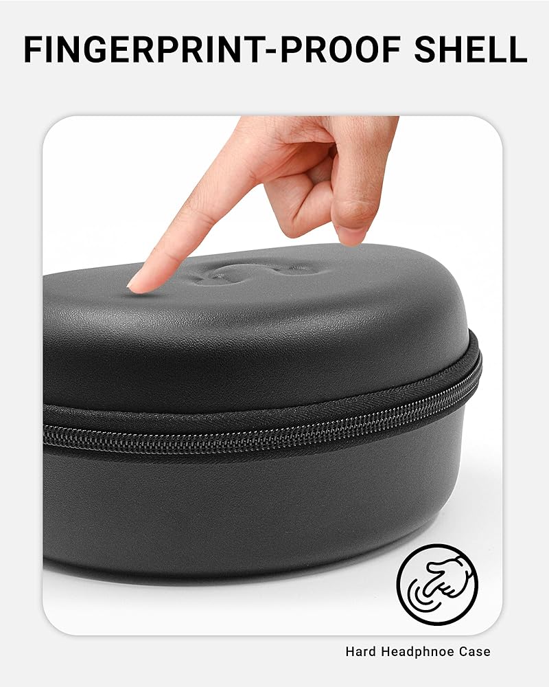 【Internal Design】Hard case for headphones with a smooth and sturdy zipper, ensuring a safe and easy closure as well as a wide opening. The additional elastic-mouth-design mesh pocket and a black storage bag hold small accessories such as charging cables and earpads for headphones, preventing them from slipping out and getting lost. The interior is made of soft material, which is good for wrapping headphones and prevents them from getting scratched.