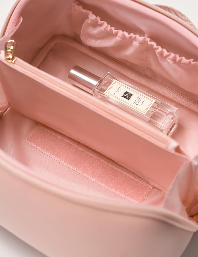✨ 𝑺𝒑𝒂𝒄𝒊𝒐𝒖𝒔 𝑪𝒂𝒑𝒂𝒄𝒊𝒕𝒚: Measuring at 8.67 x 4.7 x 4.7inches, this bag features two main compartments with four small pockets for meticulous makeup organization. The two large compartments effortlessly accommodate travel-size toiletries and sizable skincare products, while the side pockets securely hold items like concealers, lipsticks, and other travel must-haves.