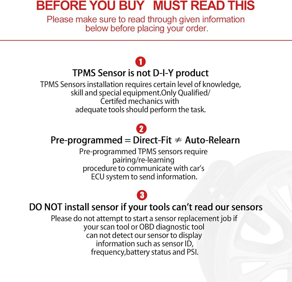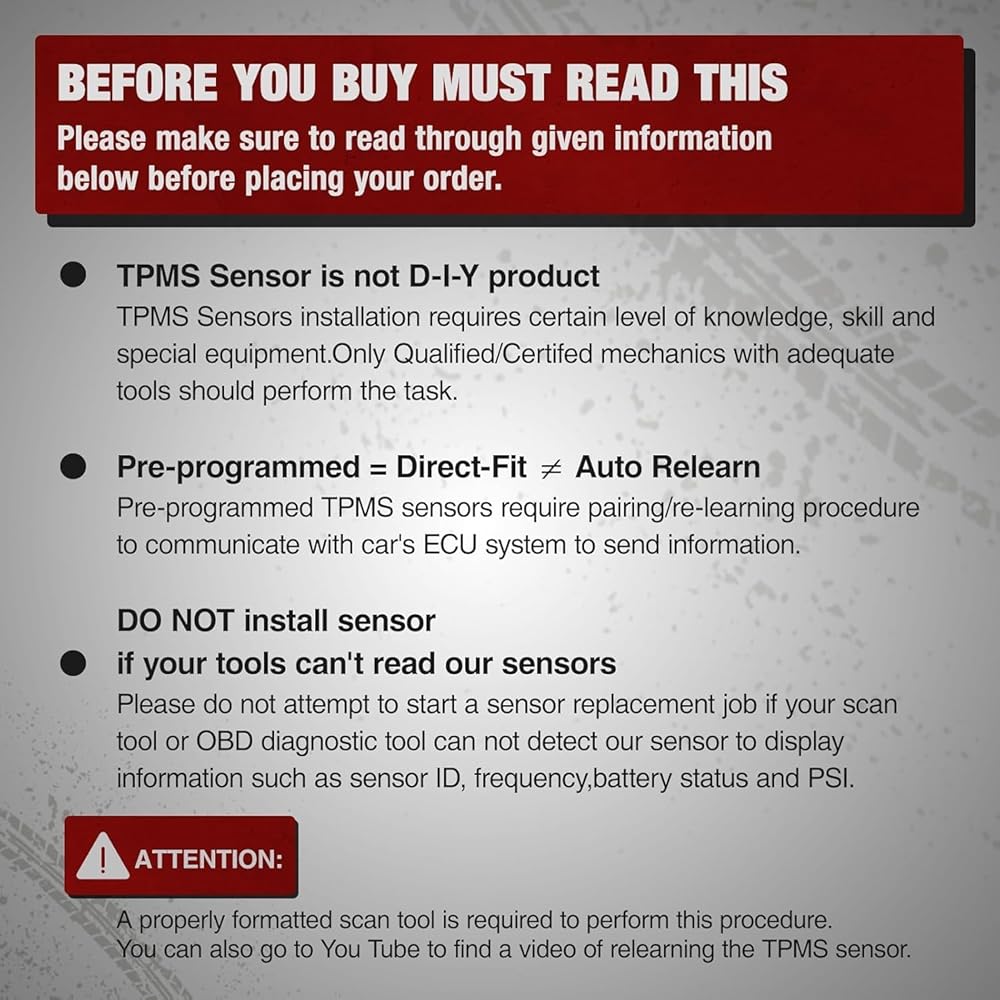 【𝐂𝐀𝐔𝐒𝐓𝐈𝐎𝐍𝐒】- 1,BDFHYK Guarantee 1-years warranty and promptly reply for your questions. 2, Please verify the fitment before order. 3, Pease use the scan tool to scan the sensor and make sure the tool can retrieve sensor information such as frequency, psi, battery status etc before install sensor on your vehicle