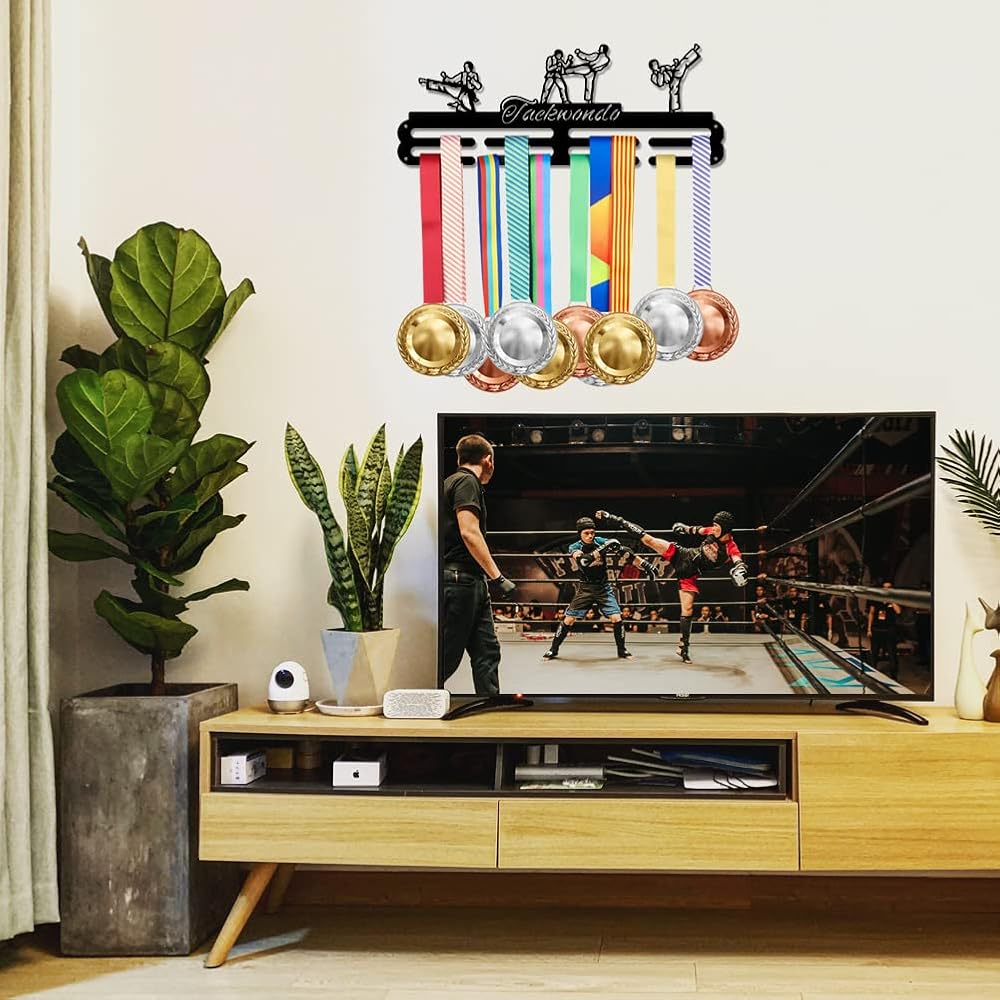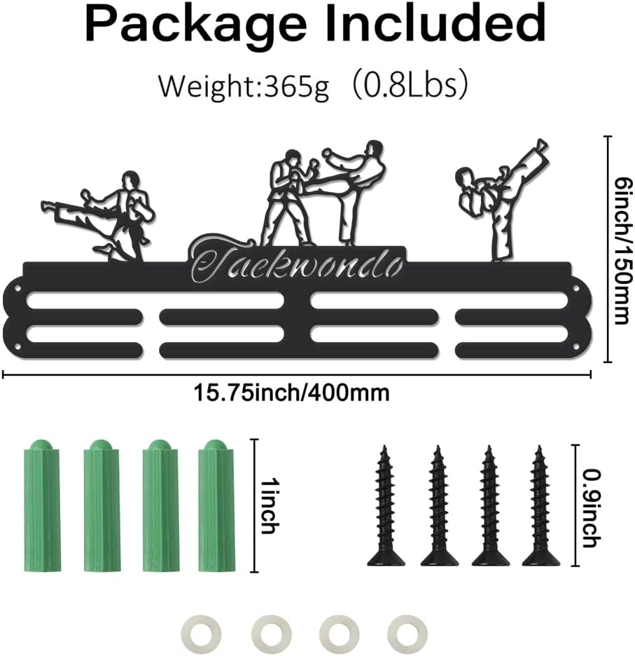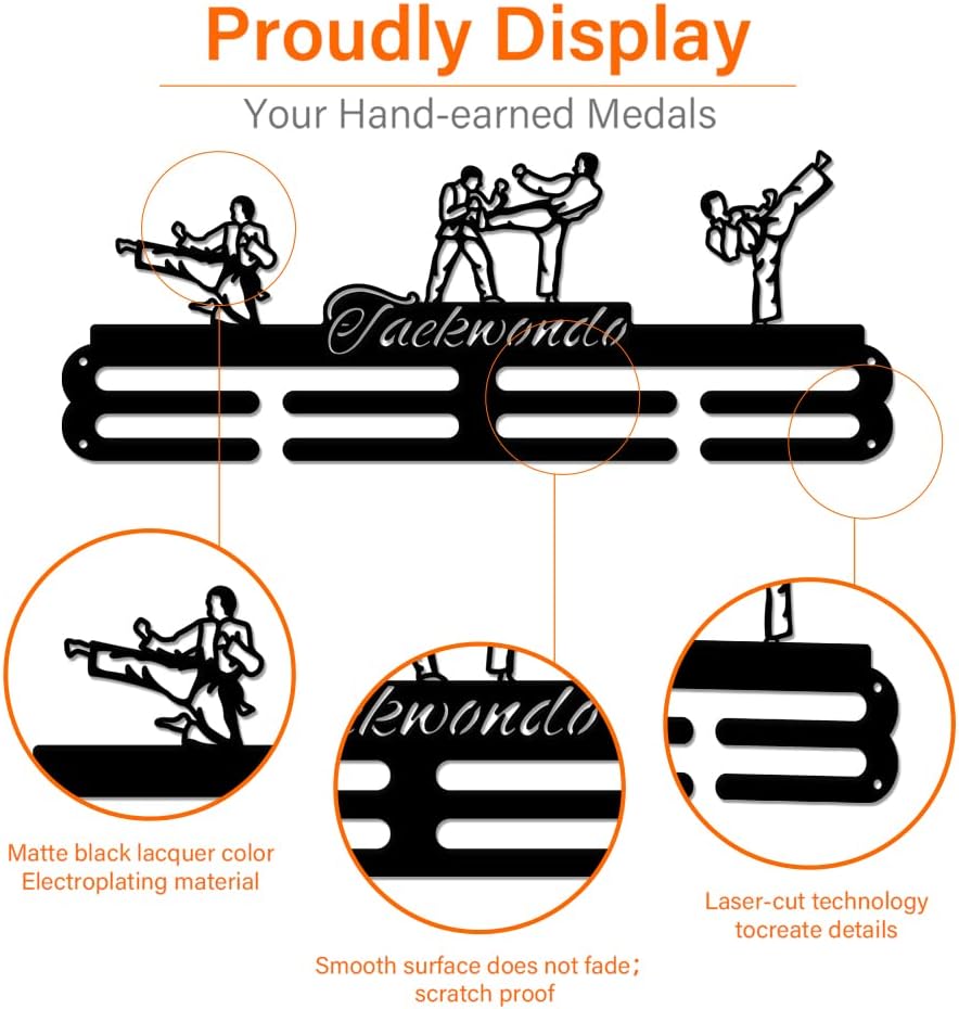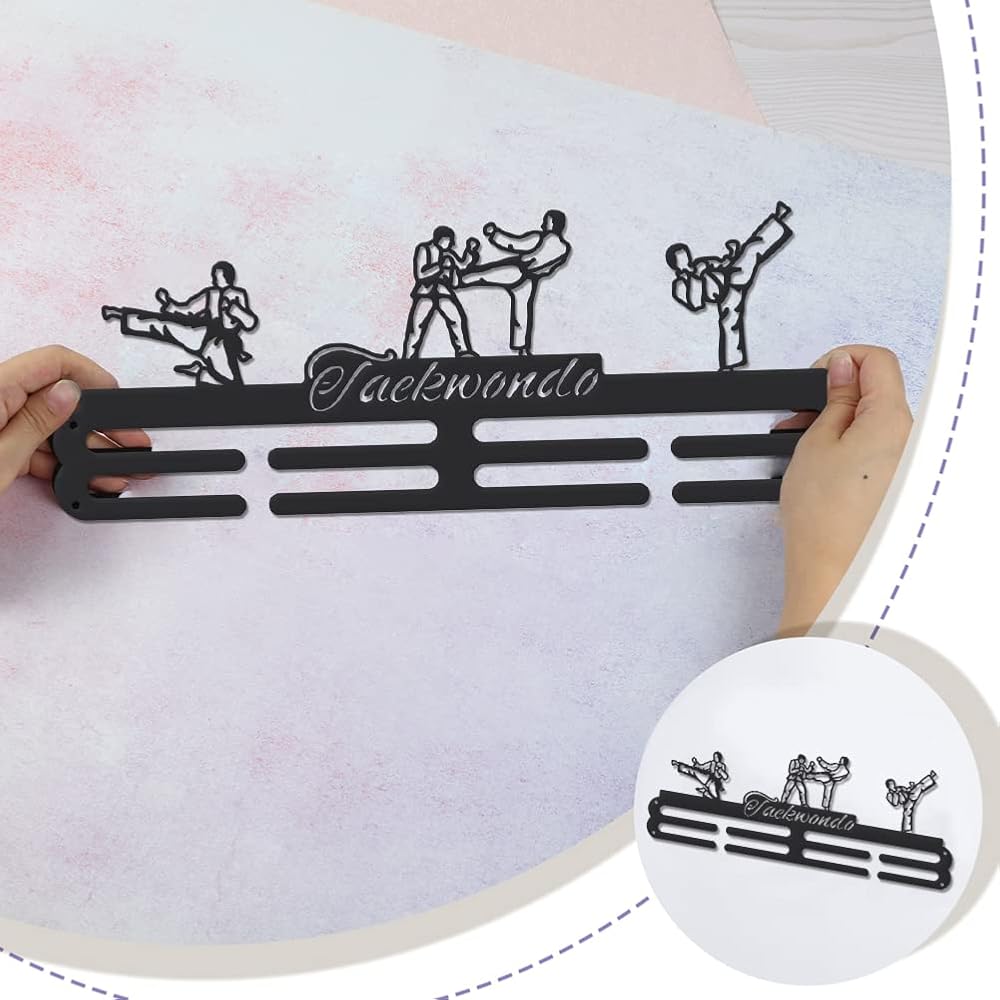 Taekwondo Medal Holder: Our Taekwondo themed medal hooks with taekwondo action and taekwondo text are our well-designed products with a brand new design. Our products have no hooks design, which looks more minimalistic and cost-effective.