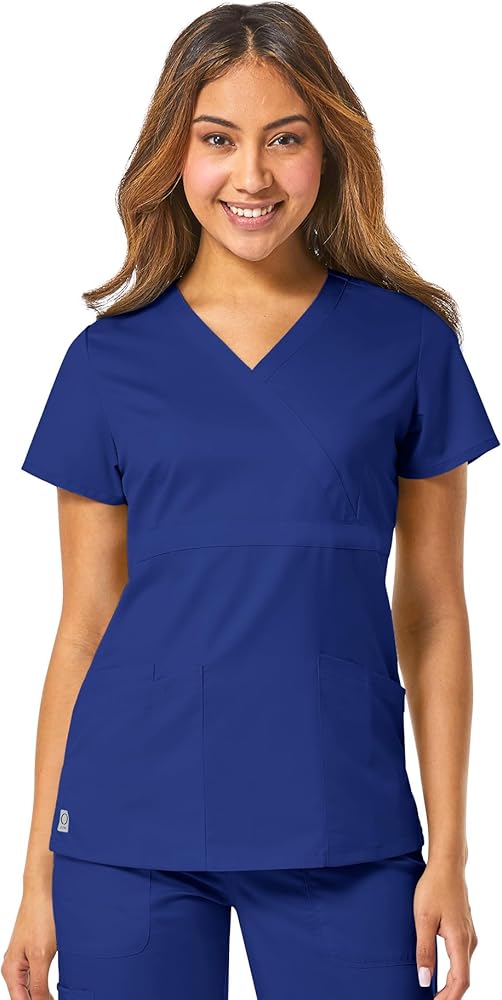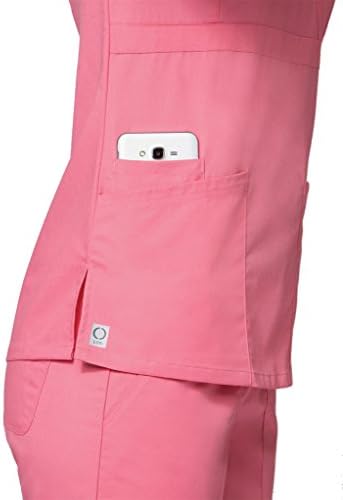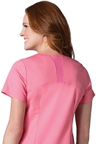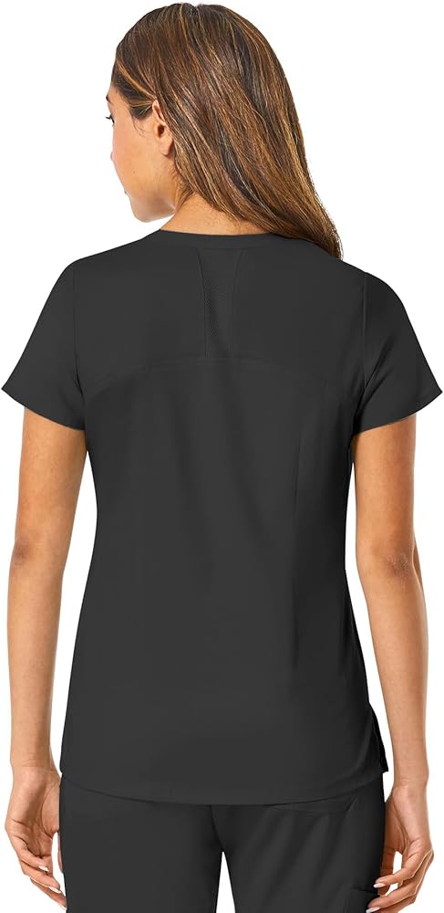 Maevn Back Mesh Panel Mock Wrap Top. Maevn EON Y-Neck Top made of 59% Polyester / 22% Rayon / 19% Elasterell-P. This is a y-neck top featuring a curved back yoke with double needle stitching. Back yoke mesh panel with piping inside. Mesh made of 83% Polyester / 17% Spandex. 2 patch pockets with cell pocket. Empire waist and bust darts. Back darts for added shape. Inner utility loop at pocket. Side vents. 27 3/4" length. COOLMAX? fabric technology by Invista employs specially engineered fibers designed to draw moisture away from the skin, keeping the wearer cool and dry.