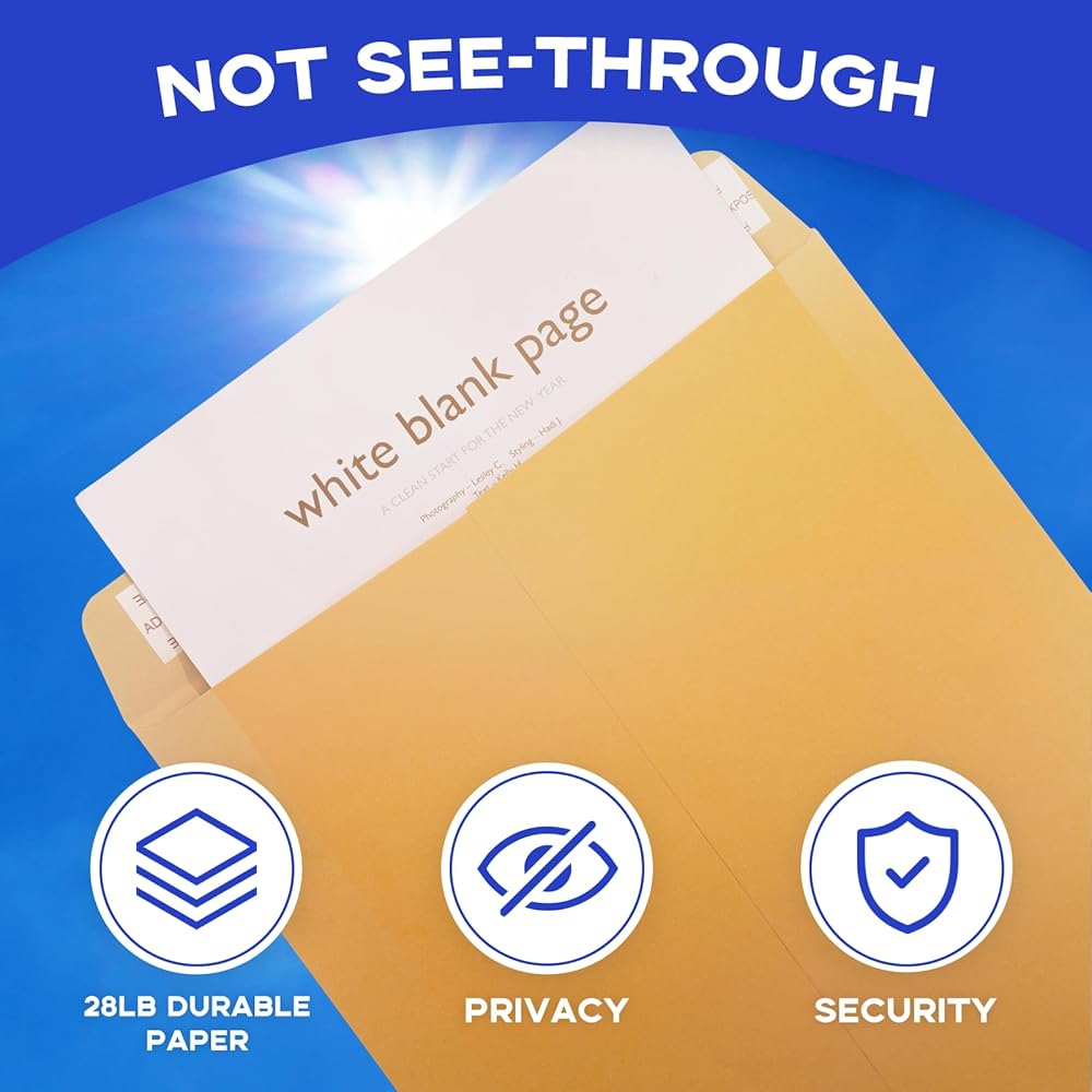 Security Envelopes: Our mailing envelopes 9x12 are made from 28lb80GSM of thick golden kraft paper with excellent tear, rip, and puncture resistance. Cannot see through and protects your privacy.