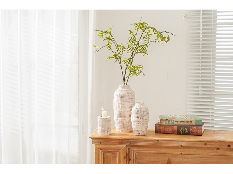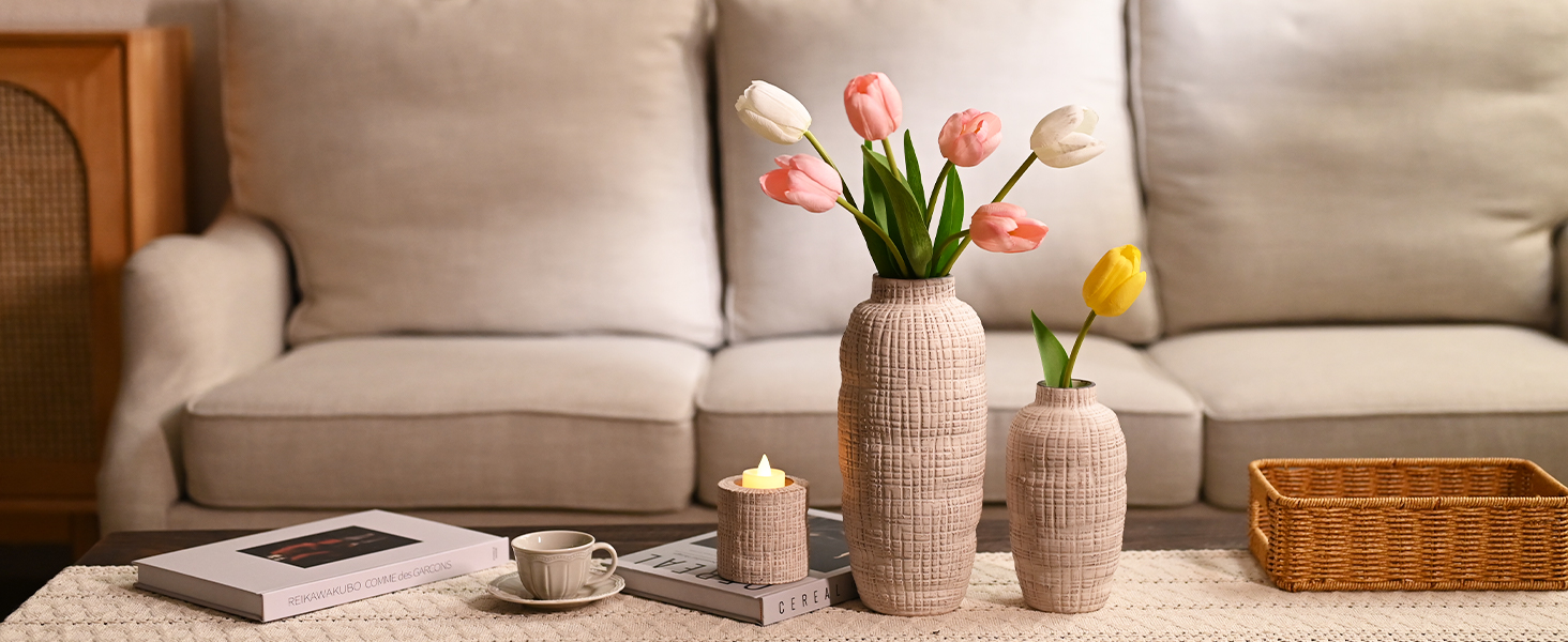 【Exquisite Craftsmanship】These beige vases and candle holder are made from high-quality ceramic. The concave convex surface with gray brown line texture and handmade feeling looks gorgeou.
