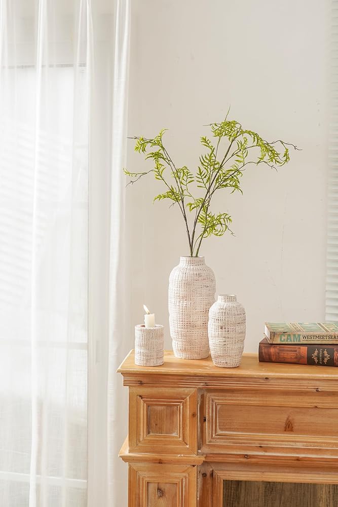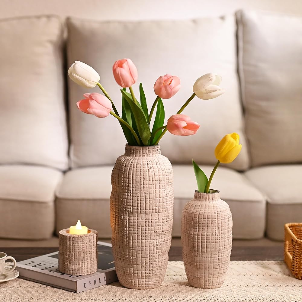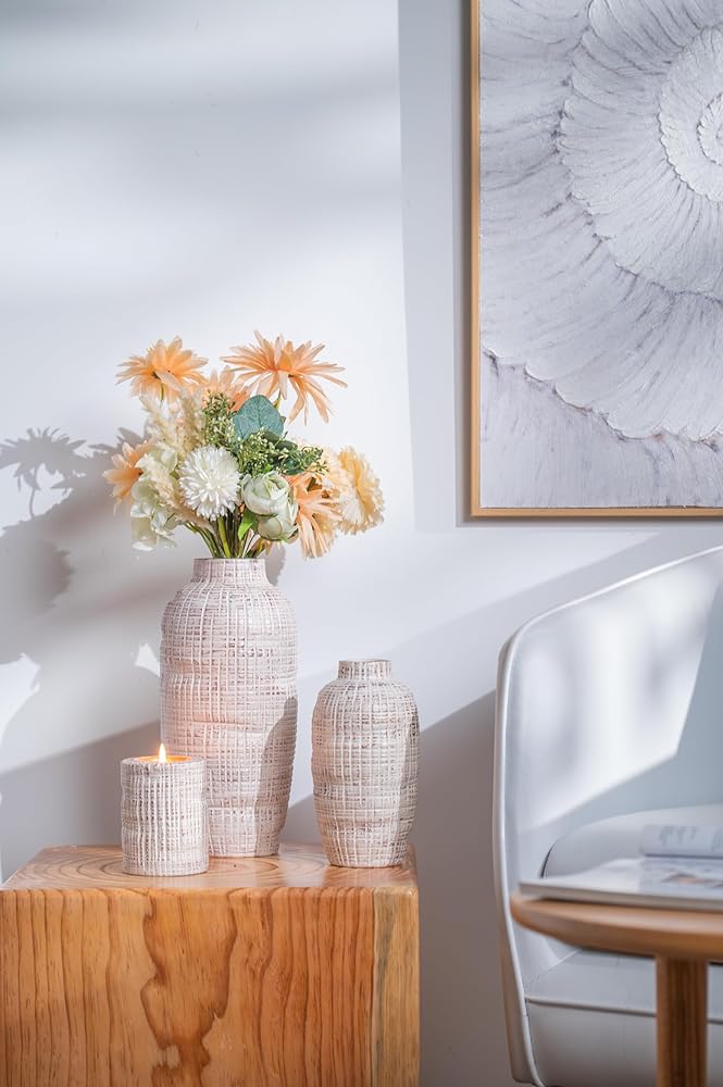 【Original Design】TERESA'S COLLECTIONS is a retail brand adhering to original designs. These large vases feature an irregular surface and raised grayish brown spot. This set includes 2 vases and a candle stick holder, an ideal home design piece to convey a vibe of calm and peace, perfect for modern farmhouse home decor.