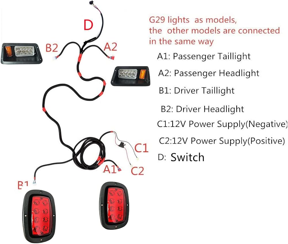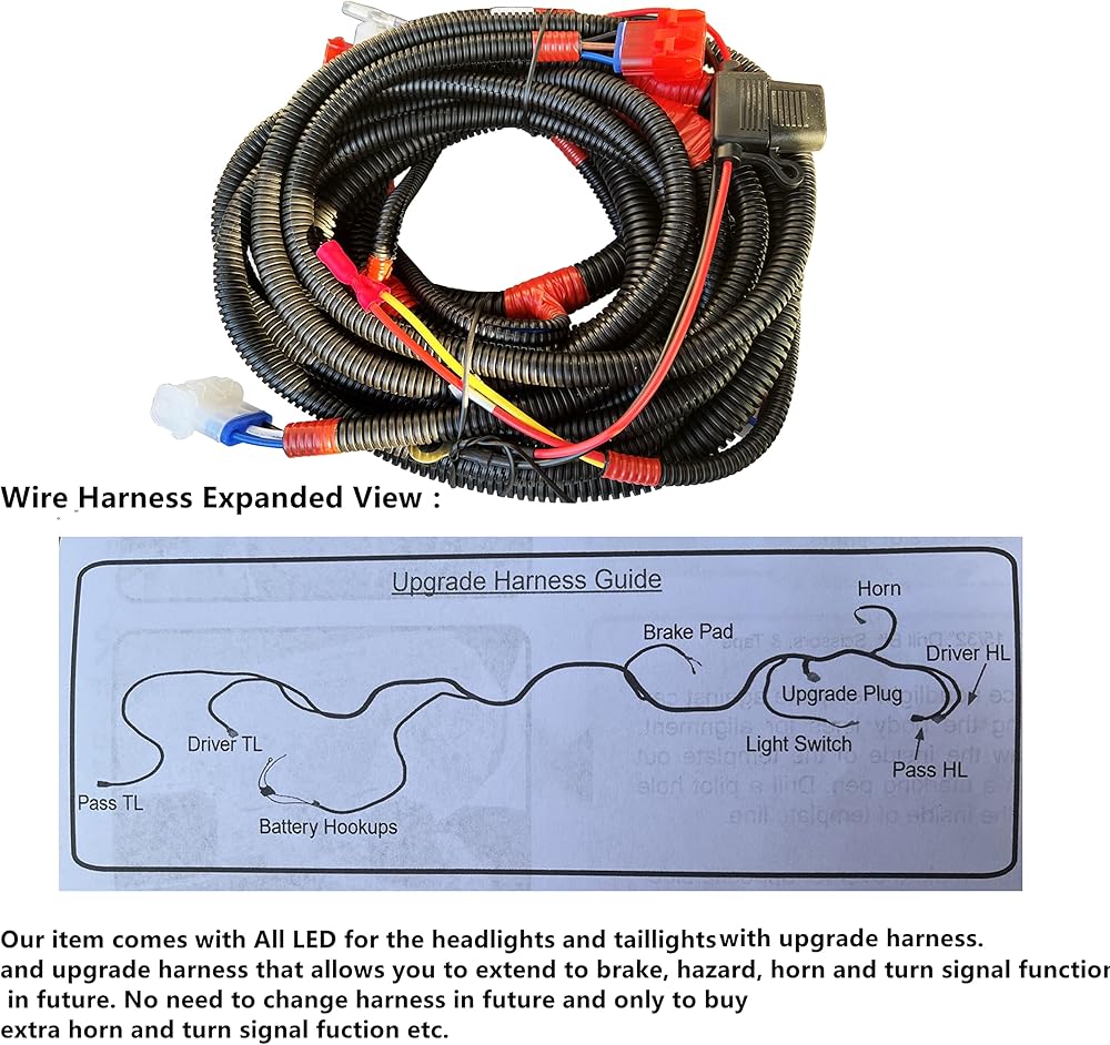 This Light Kit includes: 2* LED front headlights (left and right), 2* LED taillight(left and right), 1 switch,1* plug & play upgrade wiring harness, 1* cutting templates & screw washer set, 1* installation instructions