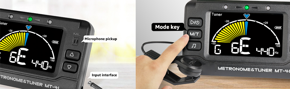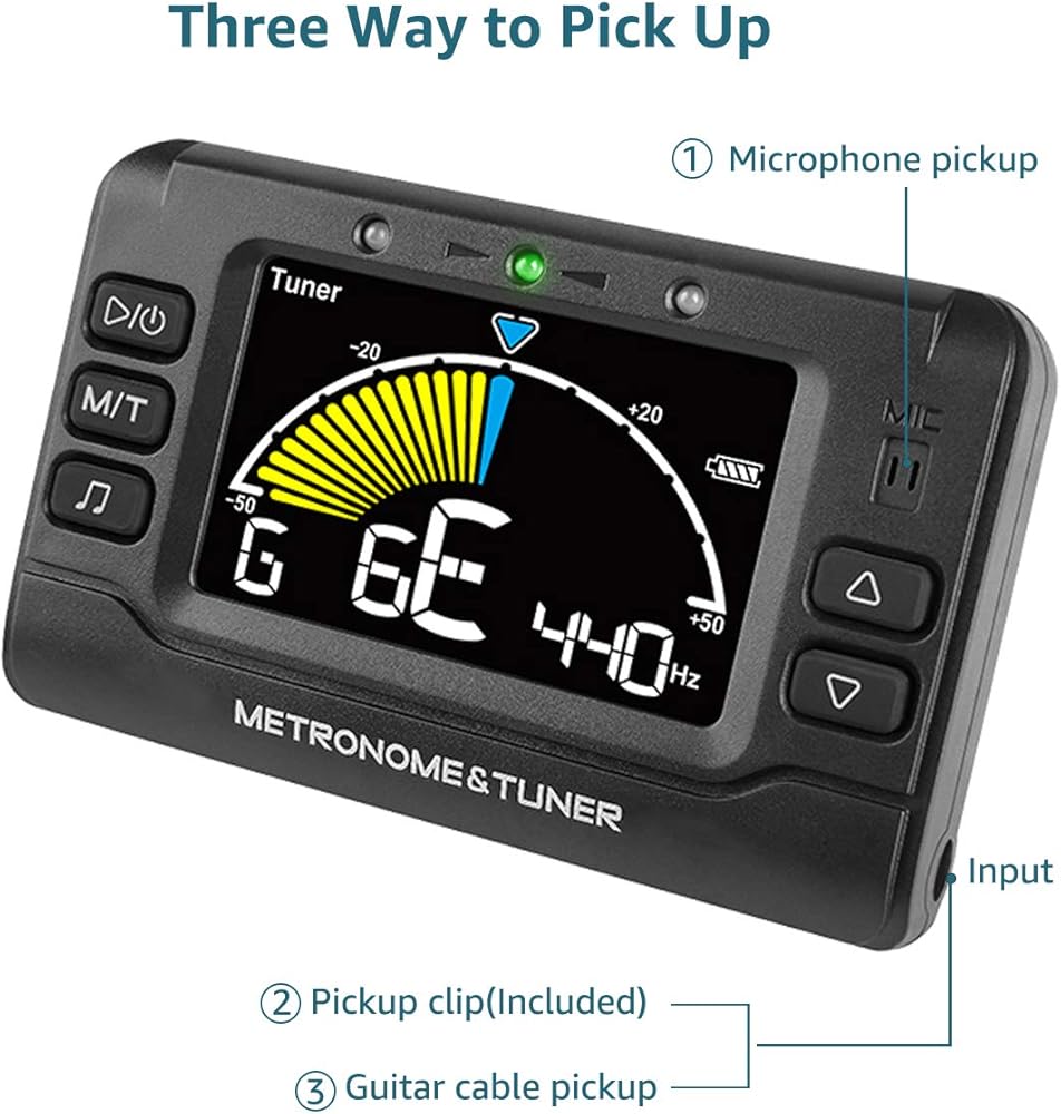 [𝟑 𝐈𝐍 𝟏 𝐃𝐞𝐯𝐢𝐜𝐞]--A metronome, tuner and tone generator, all housed in a pocket-sized device, can be used for acoustic and electric guitars, bass, ukulele, violin, mandolin, piano and wind instruments like saxophone and trumpet etc, with three ways to pickup: microphone pickup, pickup clip(included) and guitar cable pick up directly.