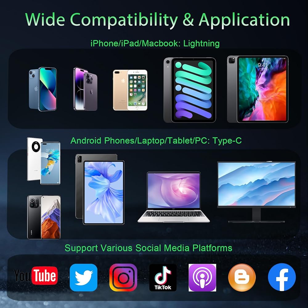 2 in 1 Universal Receiver: The wireless lavalier microphones systems includes a 2 in 1 universal receiver which is equipped with lightning and type-c interface, thus making the wireless lapel microphone compatible with both IOS and android system, including iPhone/iPad series, laptop, tablet and computer. In addition, the two-in-one receiver can effectively avoid receiver loss or confusion in long-term recording use