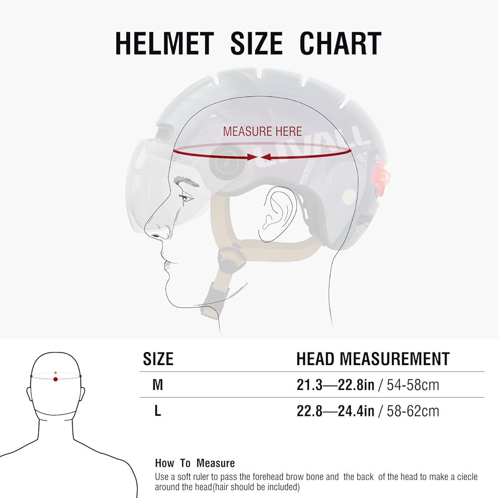 Tailored Comfort, Optimal Fit: Our ebike/ scooter/ skateboard helmet features a polycarbonate shell and EPS foam for optimal impact absorption during crashes. Adjustable straps ensure a snug fit without applying pressure to your head. Available in two sizes: Medium, fitting head circumferences from 21.25” to 22.83” /54cm to 58cm, and Large, fitting head circumferences from 22.83" to 24.4"/58cm to 62cm