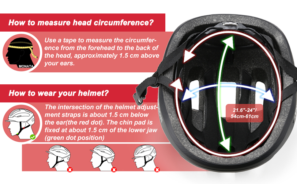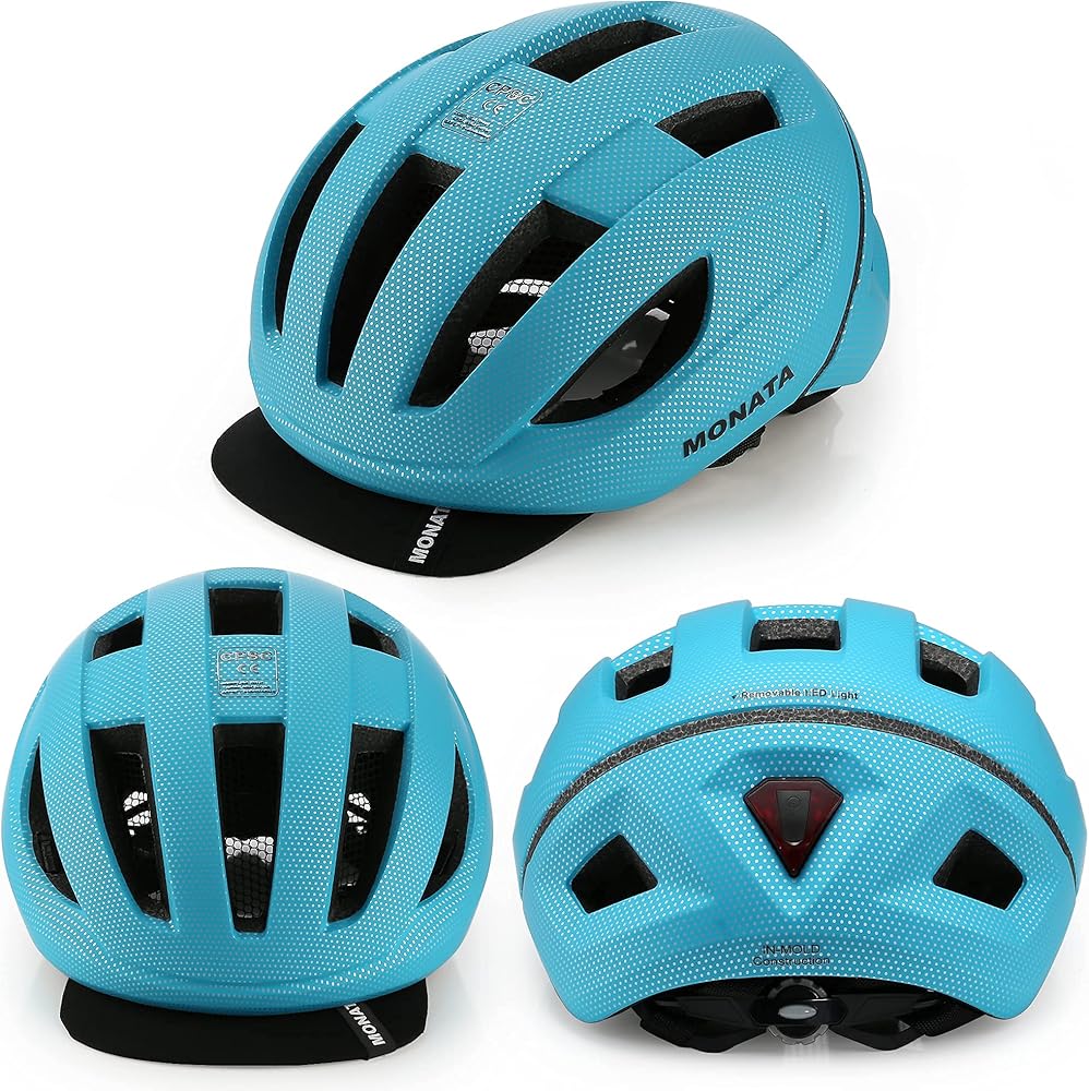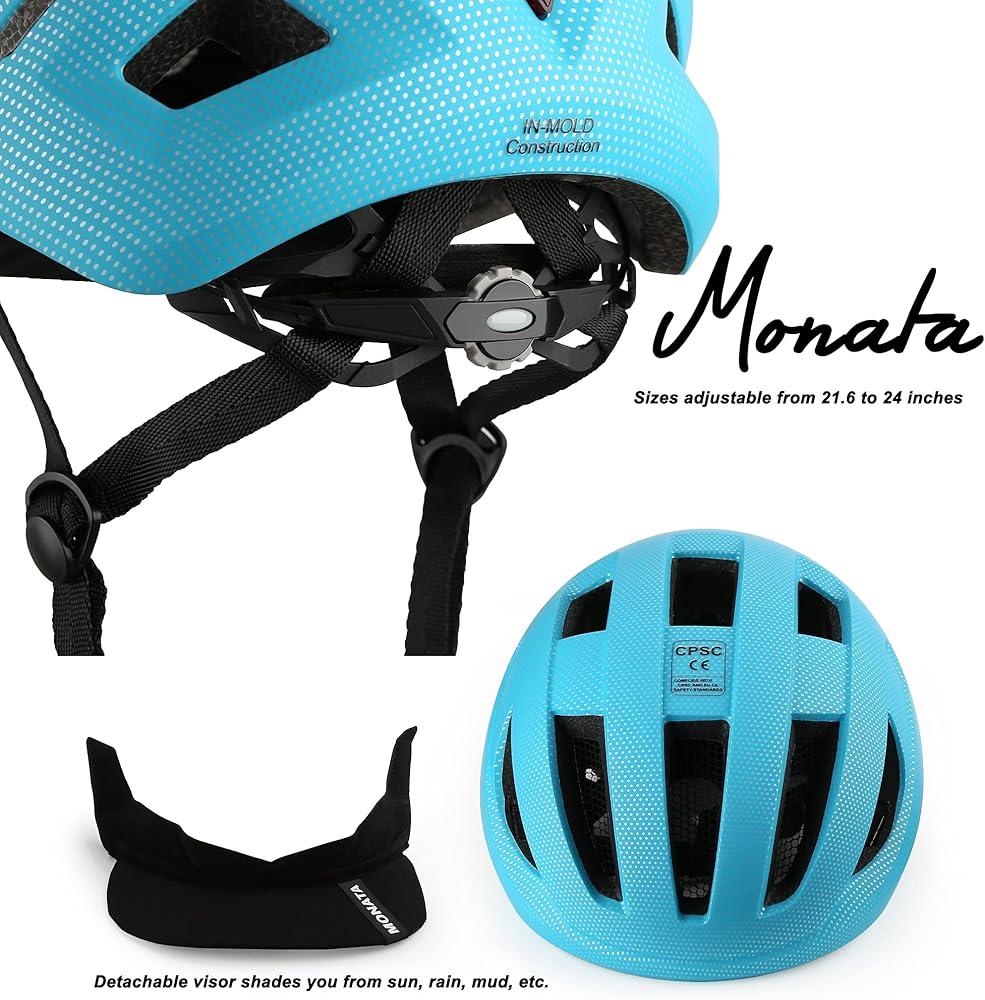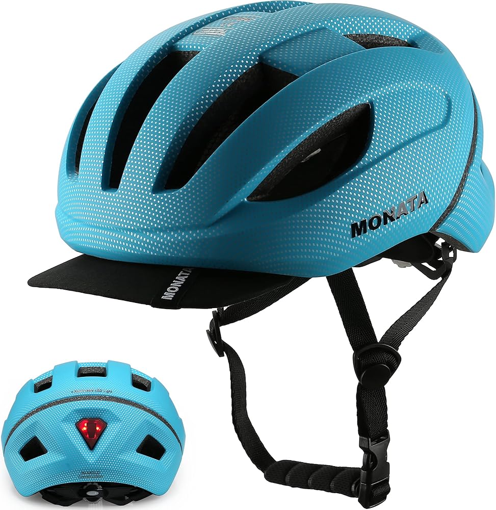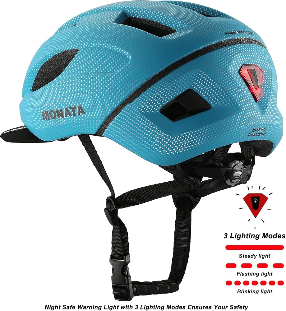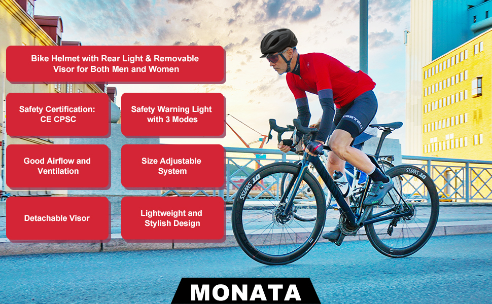【Integrated Rear Light Safety】MONATA Bike helmets with 3 lighting modes-steady, flashing and blinking light, helps other riders or cars behind you notice you fast at night, thus ensuring your safety. The button in the middle of the LED safety back light allows you to change the modes freely.