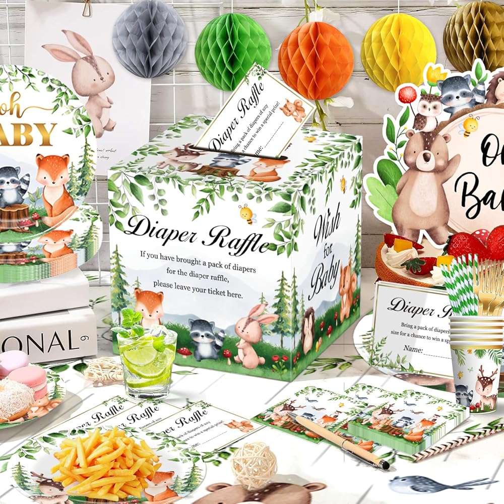 50 Woodland Diaper Raffle Tickets with Box for Baby Shower
