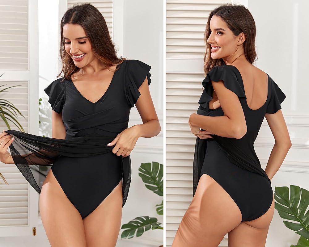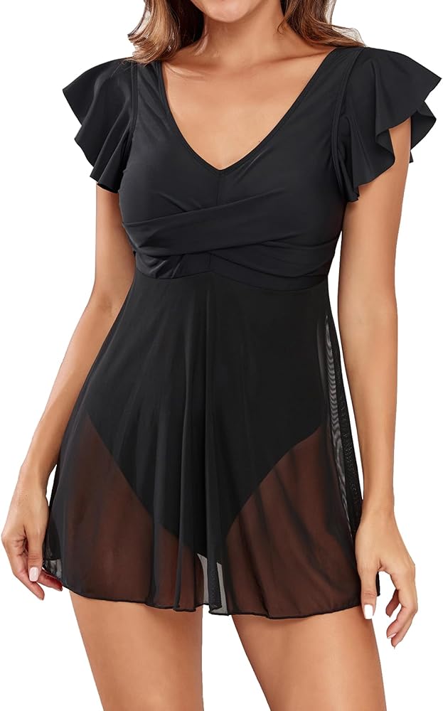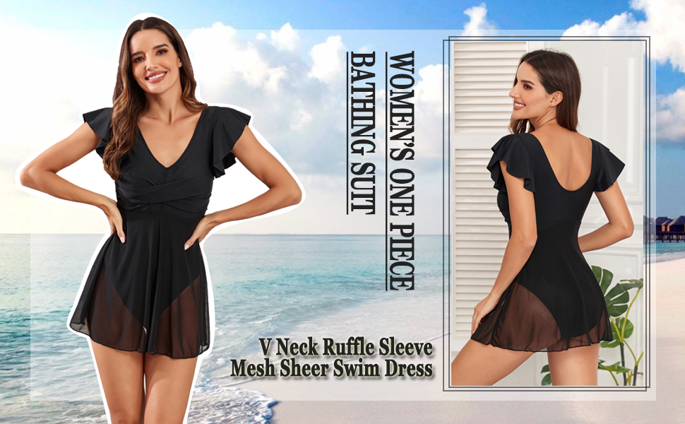 Stylish Features: Swimsuit dress is designed with ruffle short sleeves and a flowy mesh sheer skirt with built-in bottoms, creating a dynamic look while offering additional coverage and comfort.