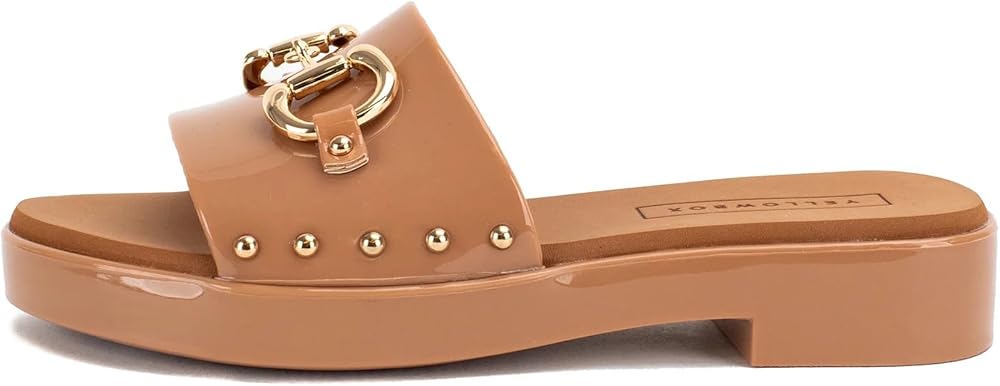 Elevate your summer look with these ANABEL jelly slide sandals, adorned with a trendy metal horsebit and studs at the side, finished with our iconic Yellow Box EVA footbed for all-day comfort.