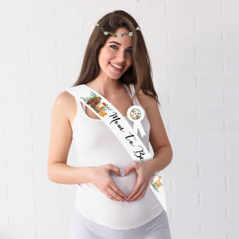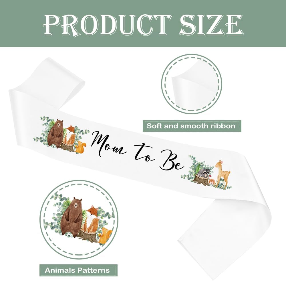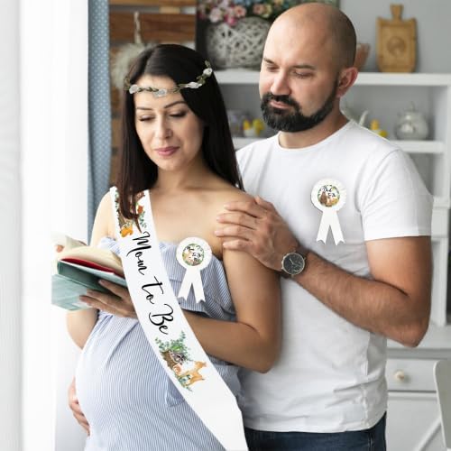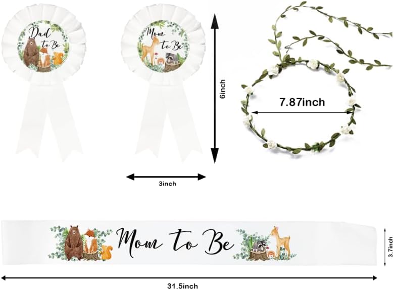Design: The woodland baby shower sash is designed with a crown of sage green leaves, and the baby shower sash for mom to be is designed with a white flower and a "Mommy" letter. The baby shower sash for dad to be is designed with a "Daddy" letter and a cute bear pattern. The baby shower sash set is very suitable for woodland theme baby showers, gender reveal parties, baby showers, mommy and me parties, etc.