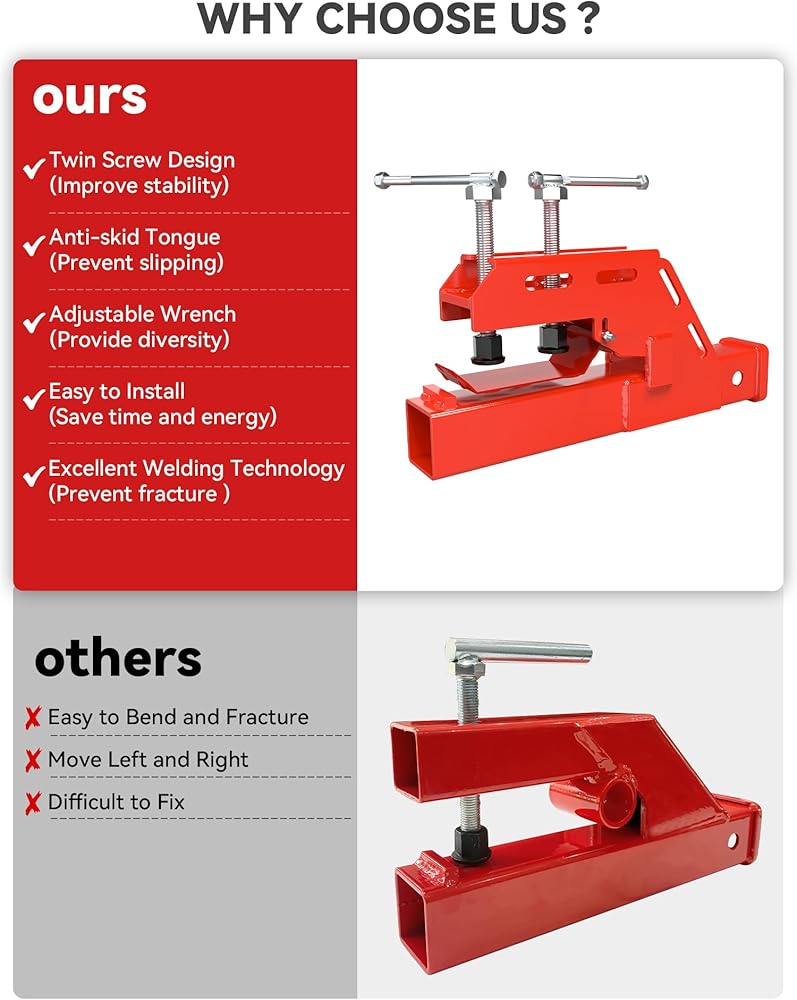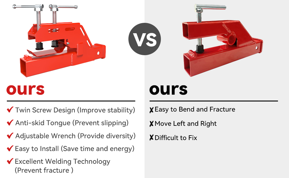【Strong Stability】Our new clamp on trailer hitch receiver adopts the anti-skid tongue, effectively increasing the contact area and improving stability. To prevent bending and fracture, the hitch receiver adopts thick twin screw design.