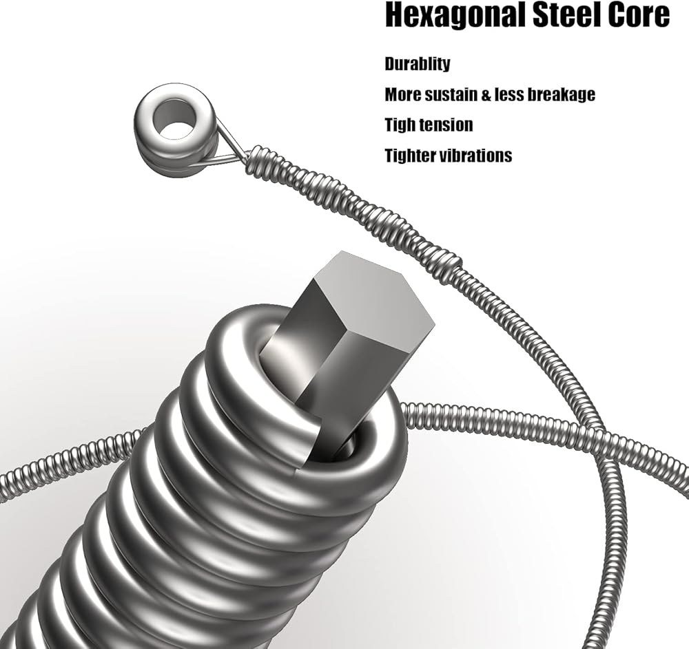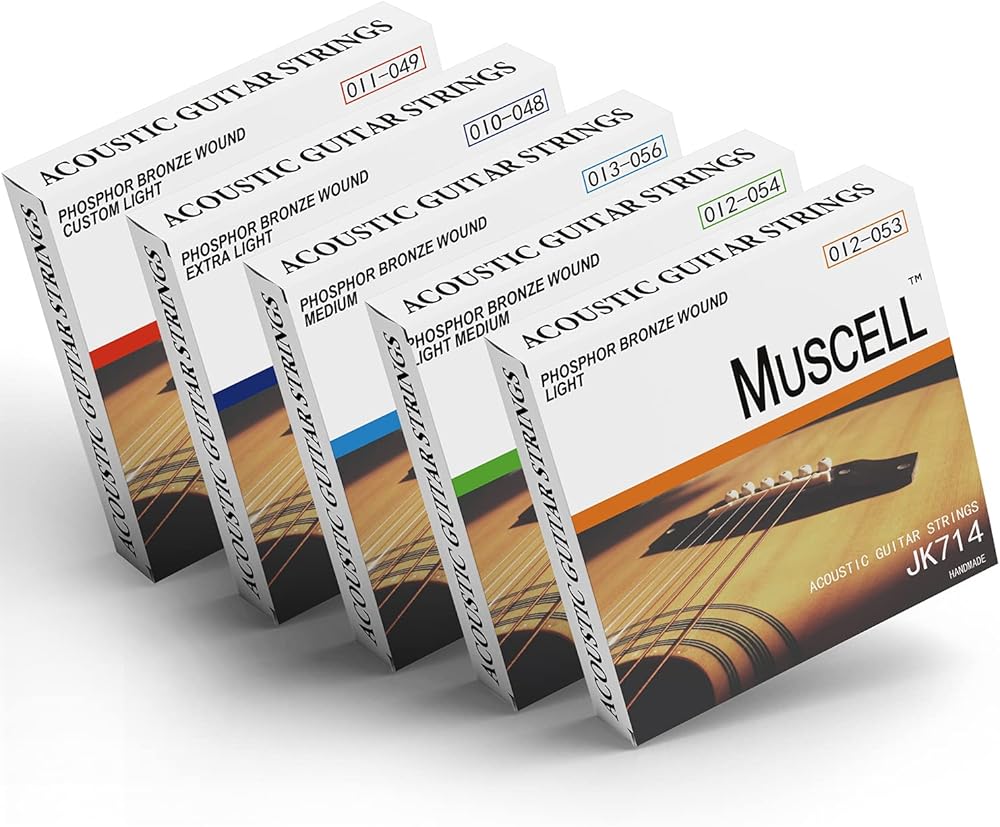 MATERIAL:Our MUSCELL Phosphor Bronze acoustic guitar strings are made of hexagonal steel core with phosphor bronze winding which feature a special, durable alloy of copper, tin and phosphor wind over a hex core.