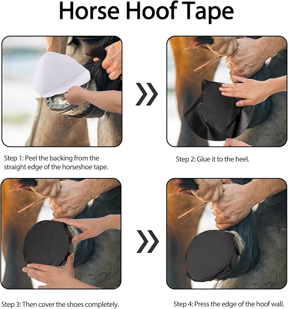 1. Wash and dry the hooves. 2. Apply hoof pads or ointment to the soles of the feet. 3. Add a wad of utility cotton. 4. Peel the backing off the straight edge of the horse hoof tape and tape it to the heel, then completely cover the shoe and press the edge to the hoof wall.