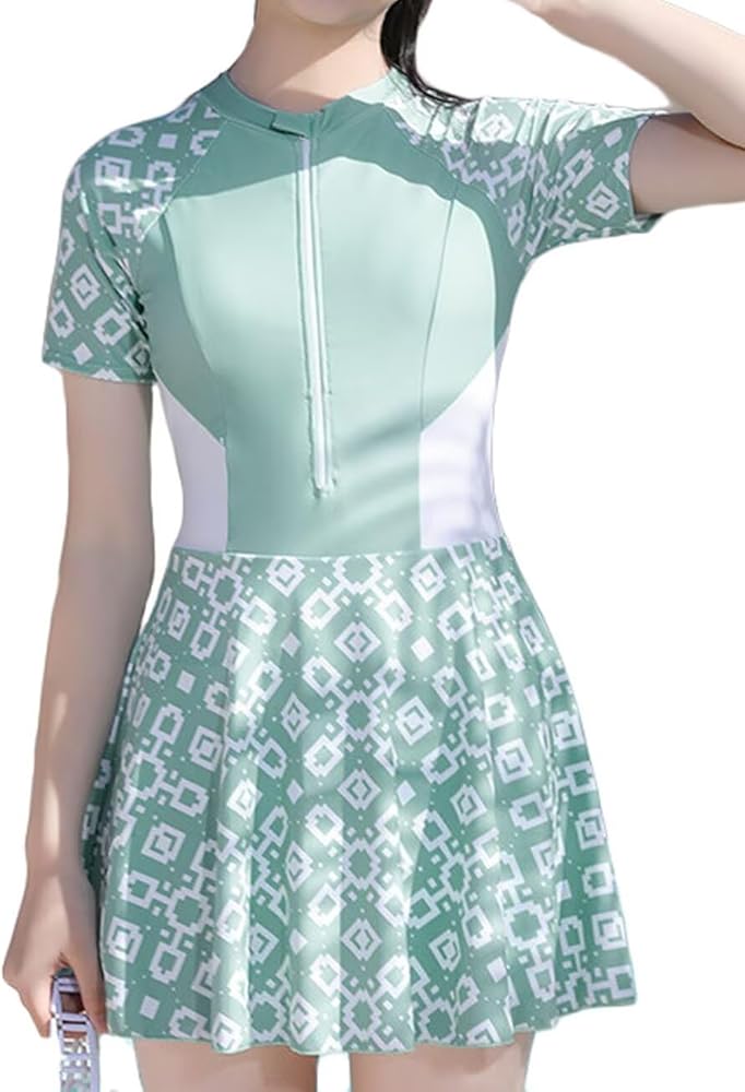 Feature & Design: One piece, short sleeve, swim dress, built-in boy shorts, zipper closure.