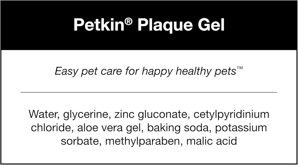 Ingredients - This dog plaque remover includes: Water, glycerine, zinc gluconate, cetylpyridinium chloride, aloe vera gel, baking soda, potassium sorbate, methylparaben, malic acid