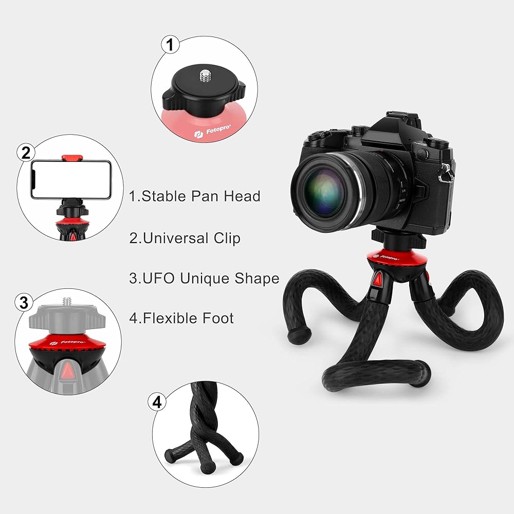 BENDABLE and DURABLE Fotopro Flexible tripod made with high-density rubber-coated Robust legs which makes it more sturdy and durable. It can wrap around lampposts, fence posts, tree limbs, bike handlebars and stabilizes your DSLR camera, action camera and smartphone.